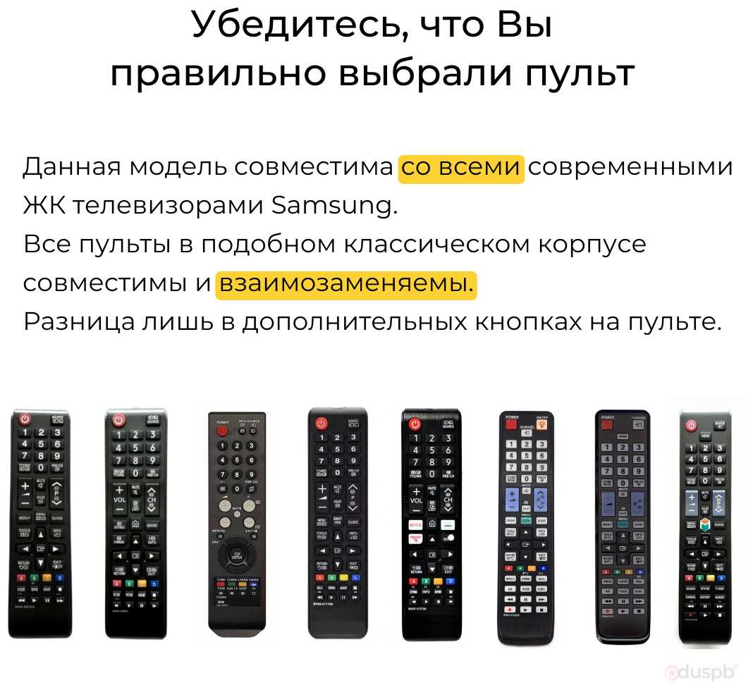 | Дополнительная информация : | Данная модель AA59-00742A совместима со всеми современными ЖК телевизорами Samsung. Все пульты в подобном классическом корпусе совместимы и взаимозаменяемы. Разница лишь в дополнительных кнопках на пульте. Подробный список поддерживаемого оборудования смотрите в «Назначении». Для Вашего удобства мы также добавили инструкции по подборке пультов. Пожалуйста, ознакомьтесь с ними перед покупкой. Можете задавать вопросы, мы незамедлительно поможем подобрать пульт для Вашего ТВ. |