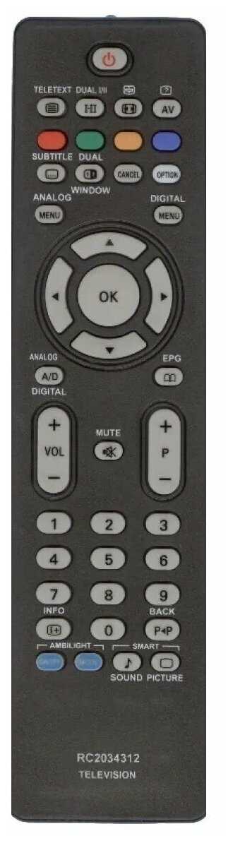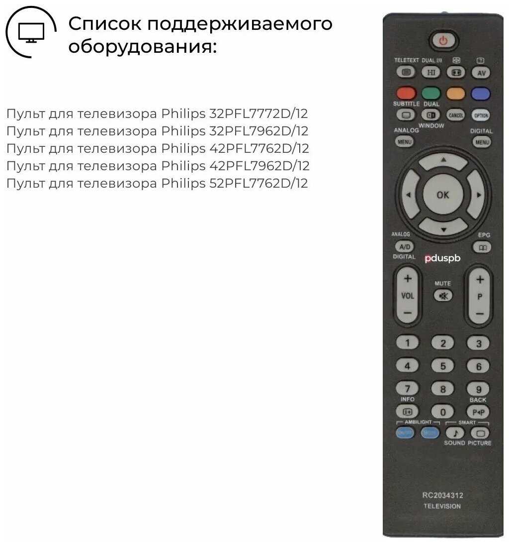 | Назначение : | Пульт RC2034312 / RC-2034312/01 подходит к телевизорам Philips: 32PFL7772D/12, 32PFL7962D/12, 42PFL7762D/12, 42PFL7962D/12, 52PFL7762D/12 |