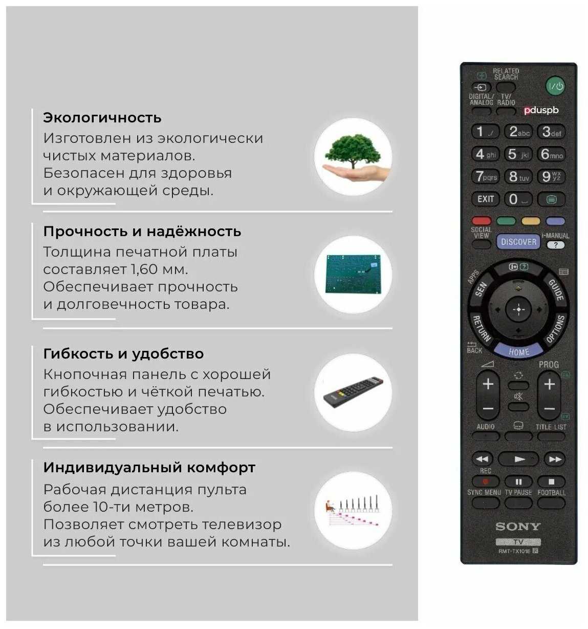 | Дополнительная информация : | Данная модель RMT-TX101E совместима со всеми современными ЖК телевизорами Sony. Все пульты в подобном классическом корпусе совместимы и взаимозаменяемы. Разница лишь в дополнительных кнопках на пульте. Подробный список поддерживаемого оборудования смотрите в «Назначении». Для Вашего удобства мы также добавили инструкции по подборке пультов. Пожалуйста, ознакомьтесь с ними перед покупкой. Можете задавать вопросы, мы незамедлительно поможем подобрать пульт для Вашего ТВ. |