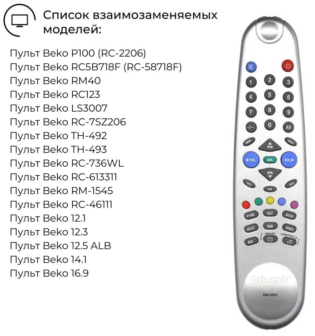 - назначение: для Универсальный пульт RM-283C для телевизоров Beko. Список заменяемых пультов: пульт Beko P100 (RC-2206)