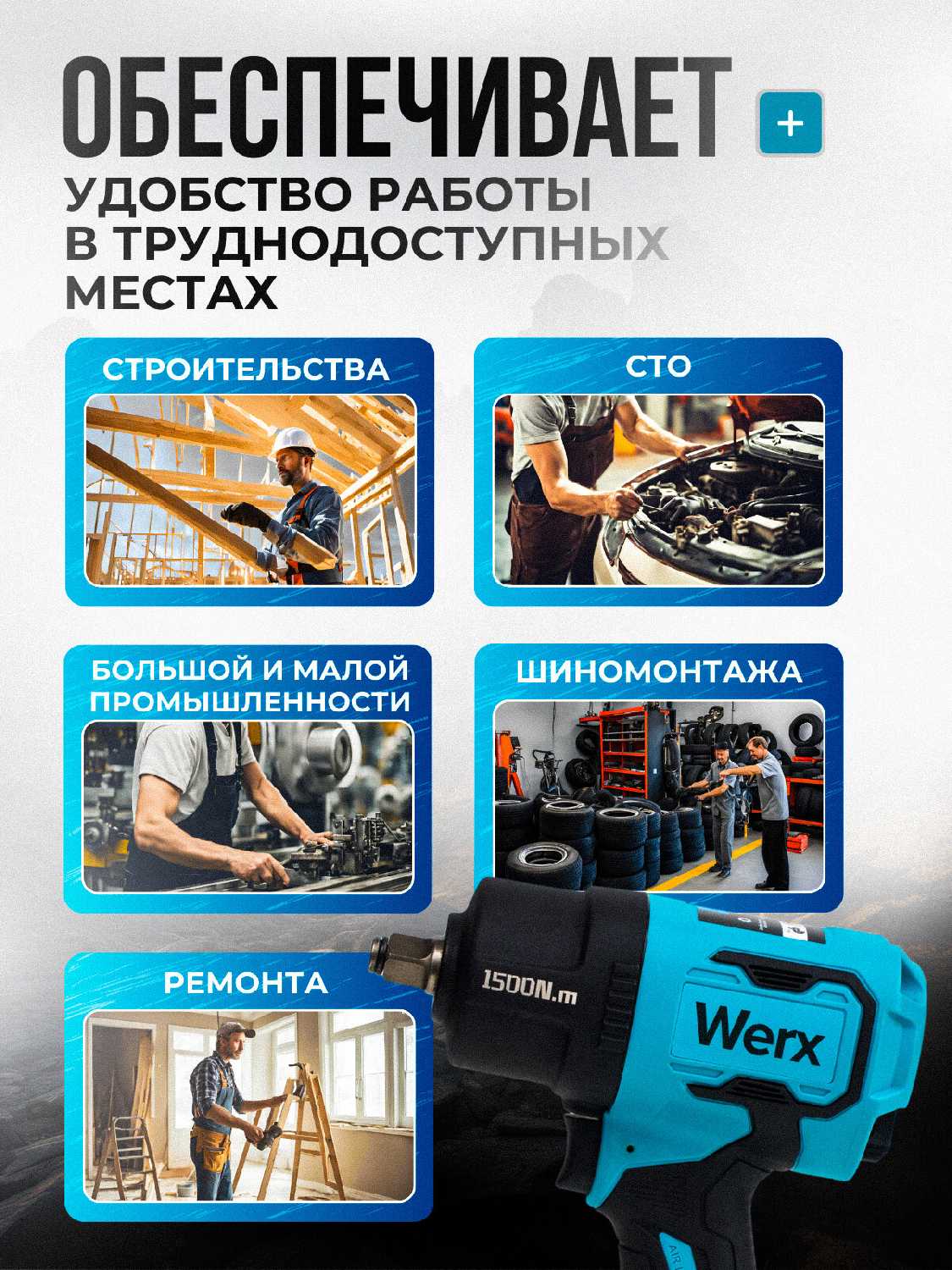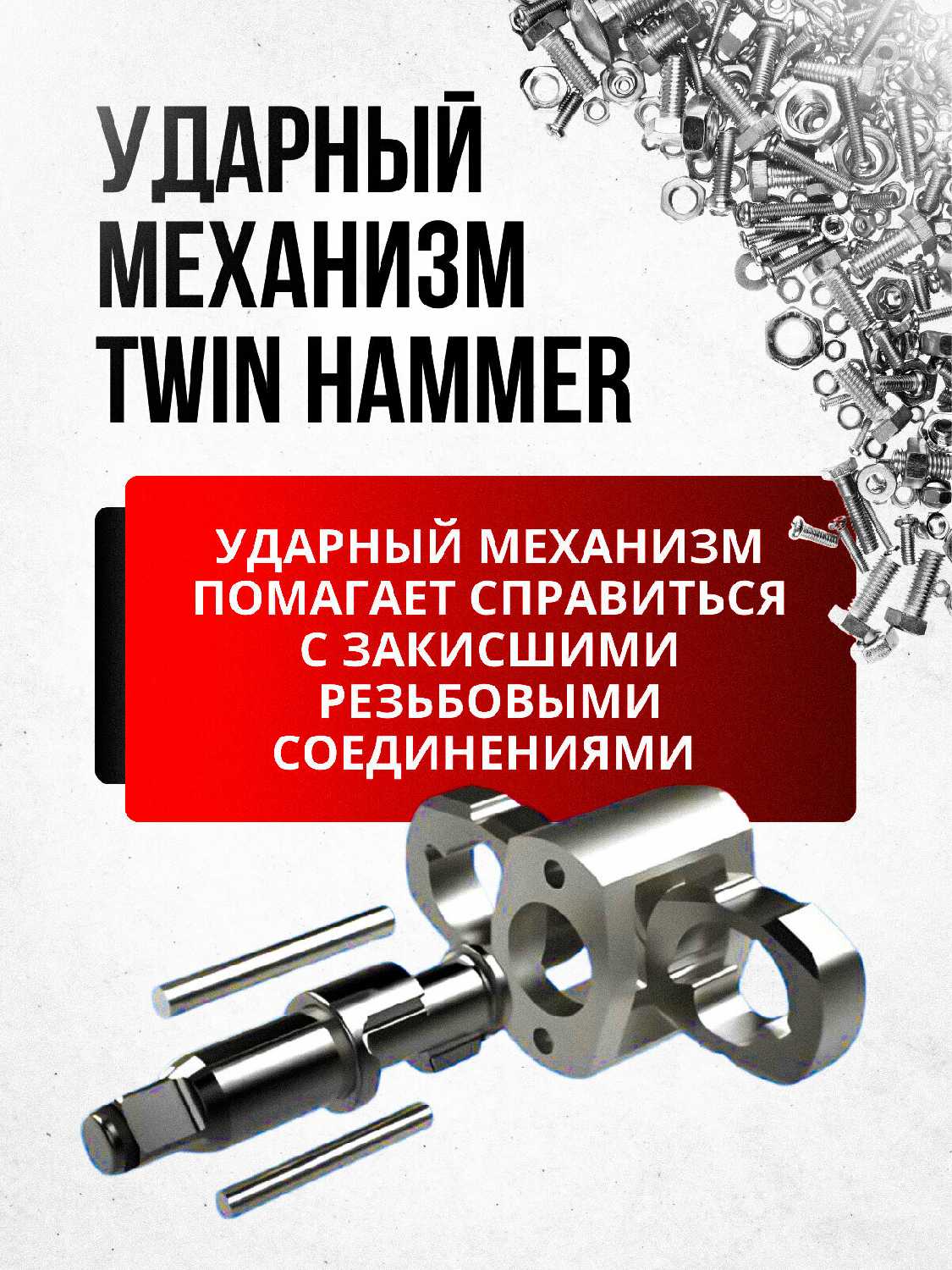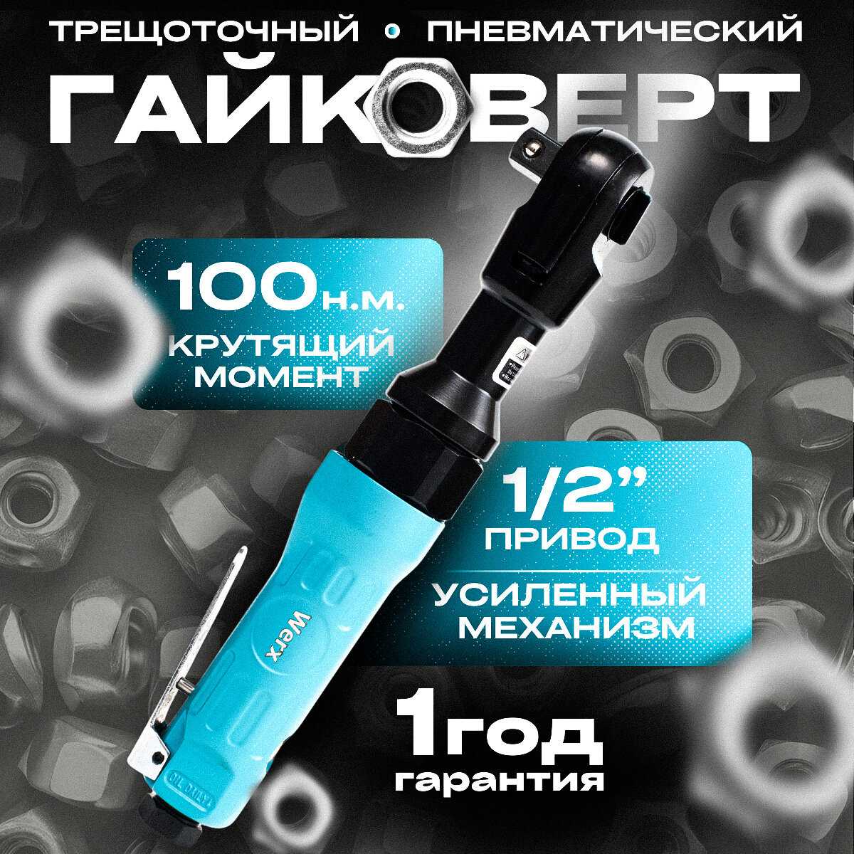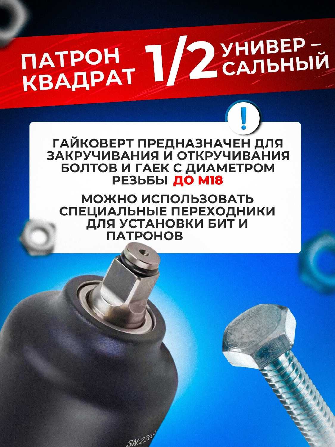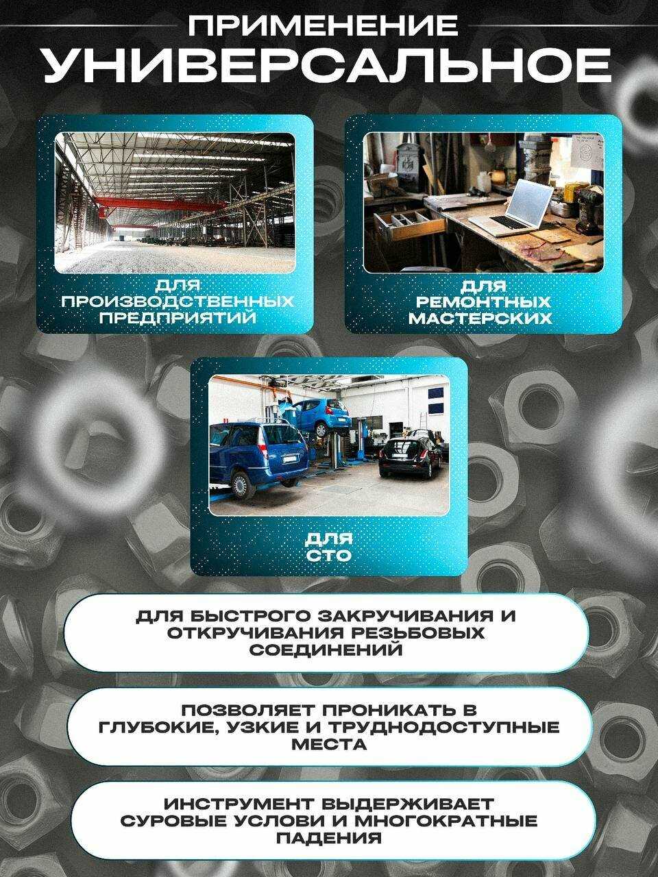 - Успешно справляется с гайками хвостовиков, болтами шкива коленвала и ступичными гайками легковых автомобилей.