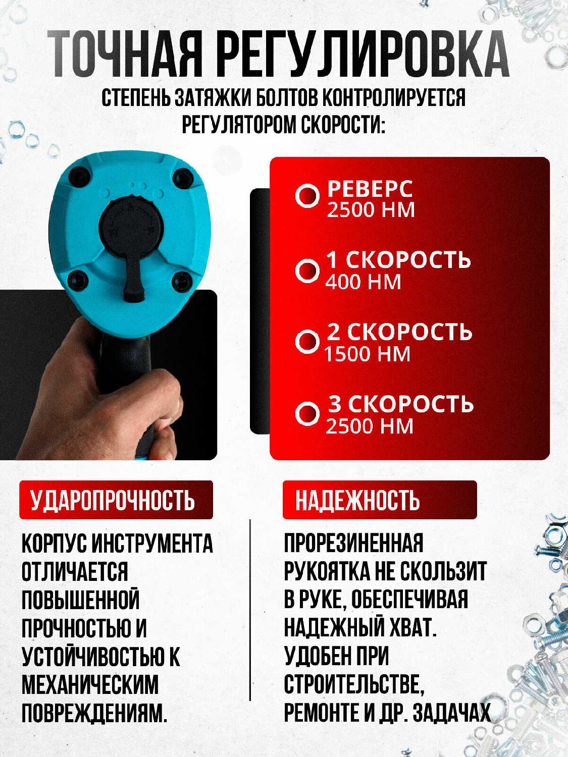 - Высокая эффективность при работе с крепежом до 22 мм:
