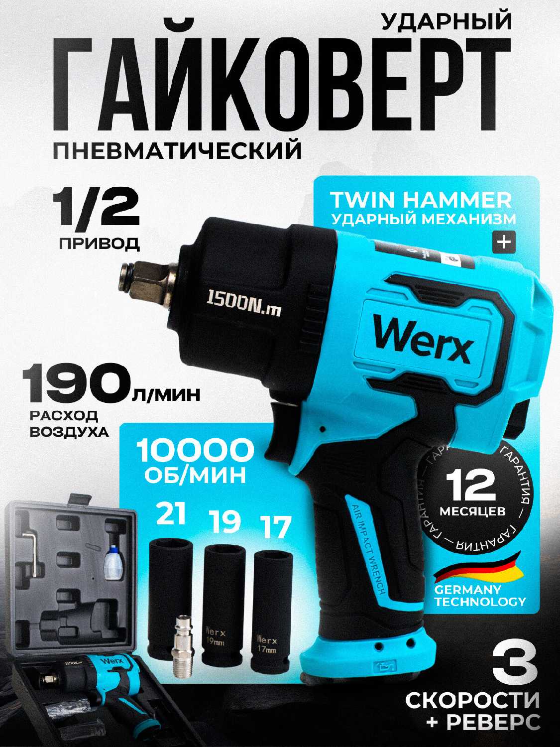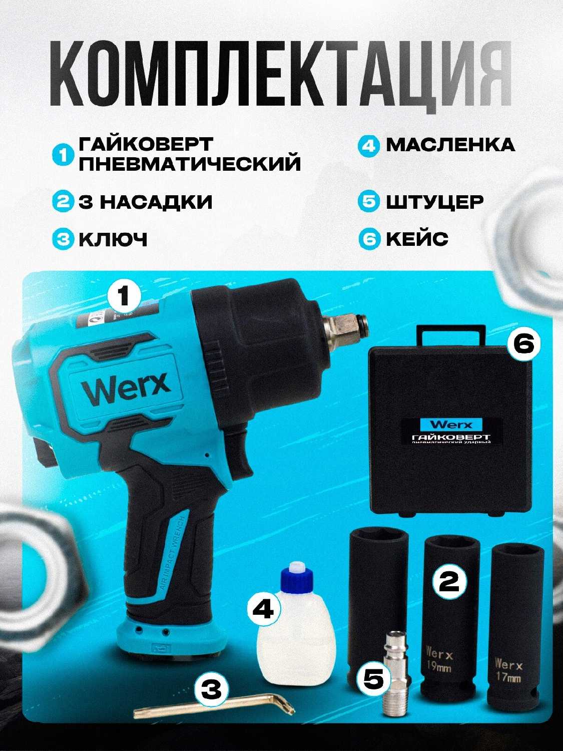 - + маленький, лёгкий и компактный гайковерт, удобен в работе с хорошим компрессором для работ в гараже и на стройке. Ручка не скальзит и при длительных работах не сильно устаёт кисть.