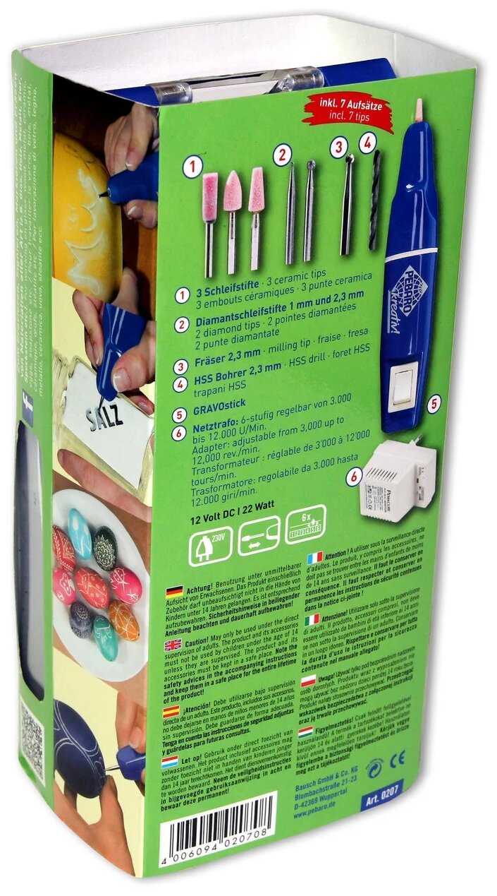| Комплектация : | - Электрический гравер (батарейки 2 AАA в комплект не входят) - Тонкая коническая шлифовальная насадка - Алмазная насадка - Сверло HSS 2, 3 мм - Набор красок для яиц - 2 пластиковые чашечки - Ручка для росписи - Инструкция по применению |