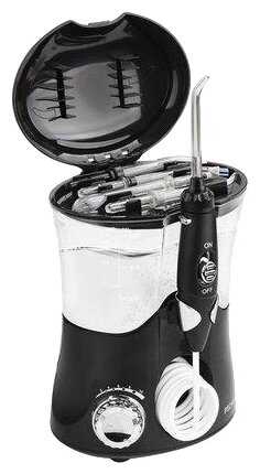 Емкость для воды 600 мл, 10 режимов работы, можно регулировать давление струи от 210 до890 кПа и колличество импульсов в минуту от 1250 до 1700. Очень удобен для чистки зубных протезов от кофе