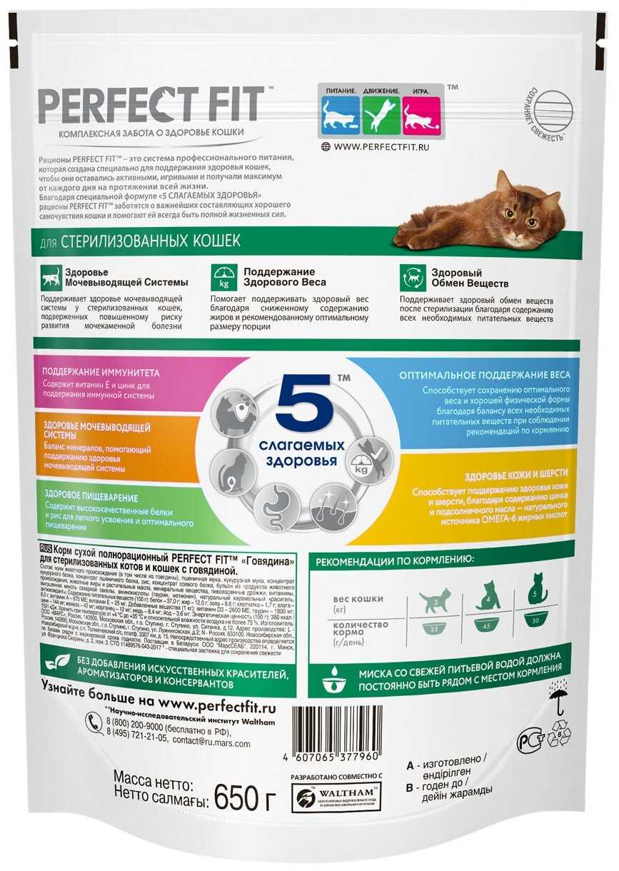 Целевая аудитория и идеальное применение: Корм Perfect Fit™ оптимально подходит именно для стерилизованных кошек, что подтверждается многочисленными отзывами владельцев таких животных. Его формула эффективно решает специфические проблемы этой группы: контроль веса и профилактика МКБ. Он хорошо зарекомендовал себя для кошек разных пород (британцы, мейн-куны, шотландцы, беспородные) и возрастов, включая пожилых питомцев. Особенно ценным его считают владельцы кошек с чувствительным пищеварением или склонных к аллергическим реакциям на другие корма ("Берем... только его. От других начинаются проблемы с кожей"). Идеален для многокотных домовладений из-за большого объема упаковки. Также отмечено, что его охотно едят даже очень привередливые кошки, что делает его надежным выбором для владельцев таких "гурманов".