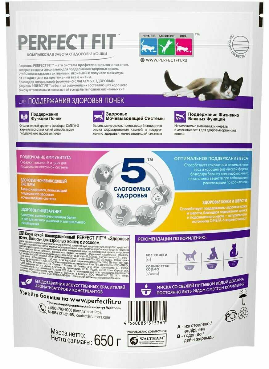 Сравнение с конкурентами и уникальные особенности: По сравнению с аналогами (упоминается Purina Probalance, другие бренды), пользователи выделяют более высокую вкусовую привлекательность Perfect Fit™ – кошки часто предпочитают его другим кормам. Текстура гранул оценивается как более мягкая ("помягче других"), что может быть преимуществом для некоторых животных. Состав воспринимается как более качественный или лучше сбалансированный для нужд стерилизованных кошек, особенно в плане профилактики МКБ. Однако упаковка проигрывает конкурентам в удобстве: отсутствие ручек (в отличие от Purina) и ZIP-застежки – существенный минус. Хотя размер гранул в основном не вызывает проблем, один отзыв отметил, что они "крупноваты". Основным конкурентным недостатком пользователи считают высокую цену ("цена кусается", "дороже аналогичных", "цена стала выше"), несмотря на признание его качества. Уникальной чертой является его проверенная годами (многолетними отзывами) эффективность в поддержании здоровья стерилизованных кошек при длительном применении без негативных последствий.