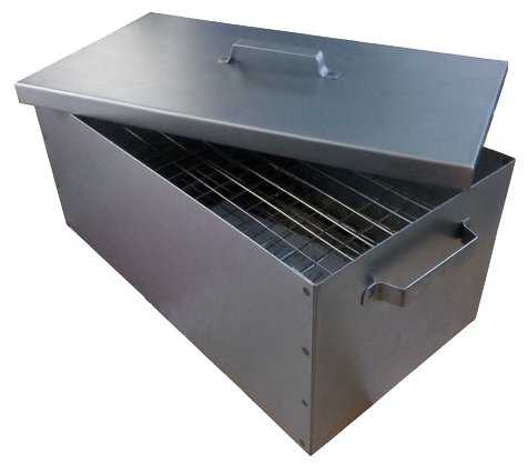 - - Нет гидрозатвора, просто короб, не знаю что за металл, но после копчения оставил в мангале, пошёл дождь, на утро покрылась пятнами ржавчины. Металл тонкий, только для углей.