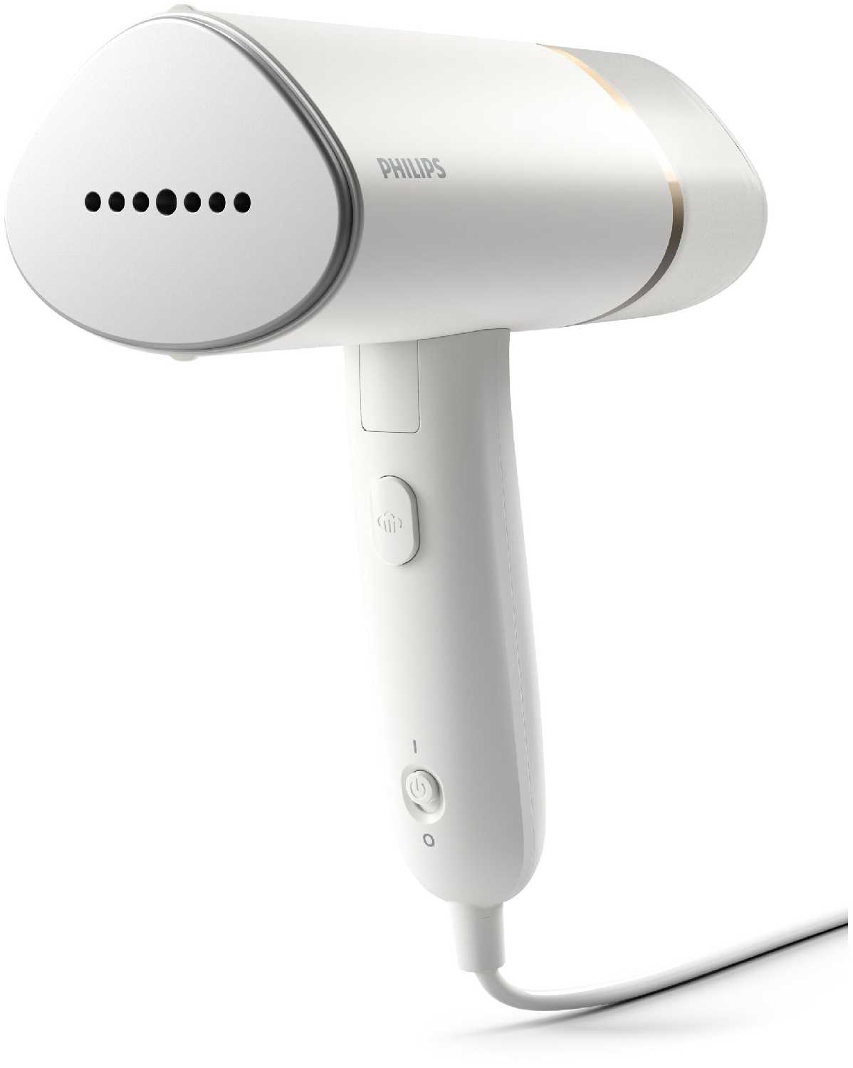 На вид у отпаривателя нет ничего лишнего - удобная ручка и современный дизайн в белом стиле.