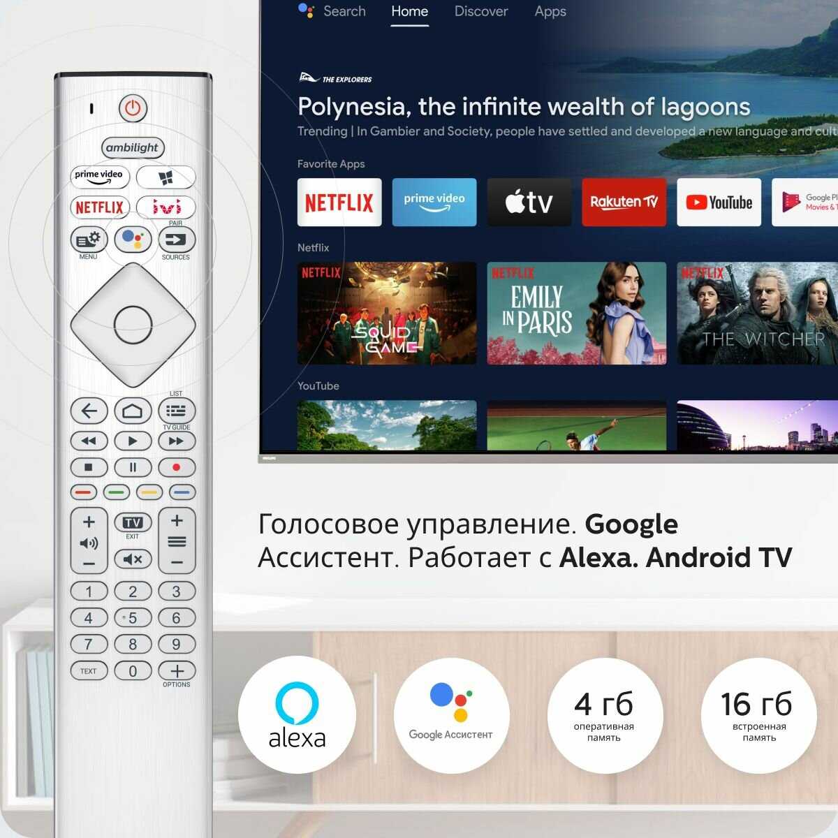 - Поиск контента, управление яркостью Ambilight и запуск приложений голосом.