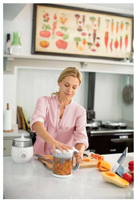 Когда в семье двое детей, особенно ценишь свое время) Можно, конечно, кормить дитё из банок, но я считаю это лишним, когда мама сама в состоянии сделать пюре. При первом использовании не сразу поняла что к чему, но прочла инструкцию и проблемы отпали - нужно было просто освободить чашу от лезвий и контейнера. Варит на пару быстро, а потом переворачиваешь емкость и мелешь блендером, нажимая на кнопку. Порадовала возможность разогреть или разморозить продукты, для хранения имеется контейнер, устойчивый к холодным температурам.