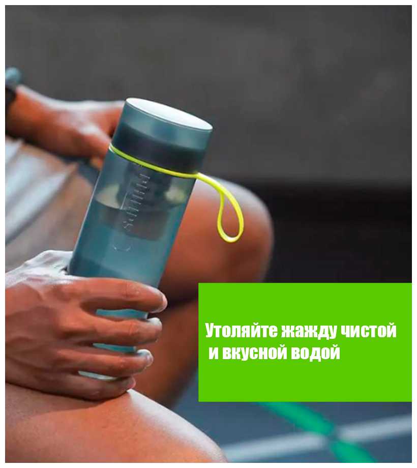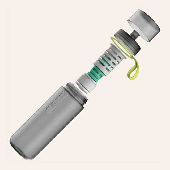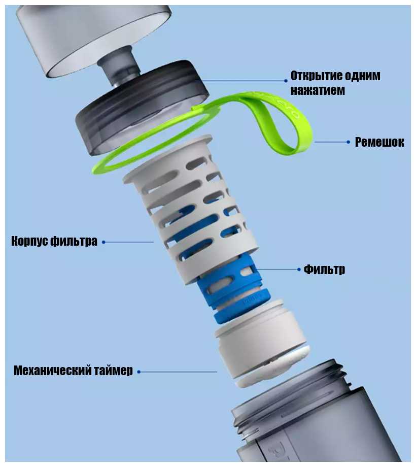 - + герметичная, сменный фильтр, есть ушко для переноски бутылки