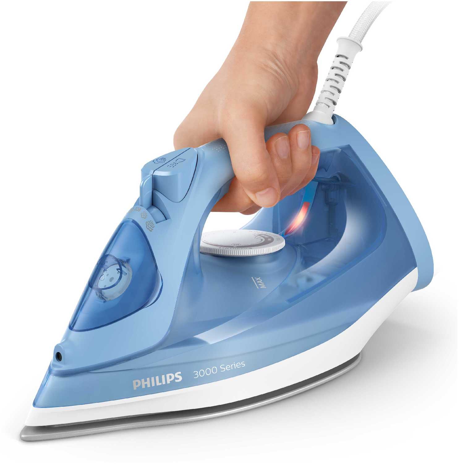 - Корпус из прочного пластика с продуманным распределением веса обеспечивает устойчивость на гладильной доске.