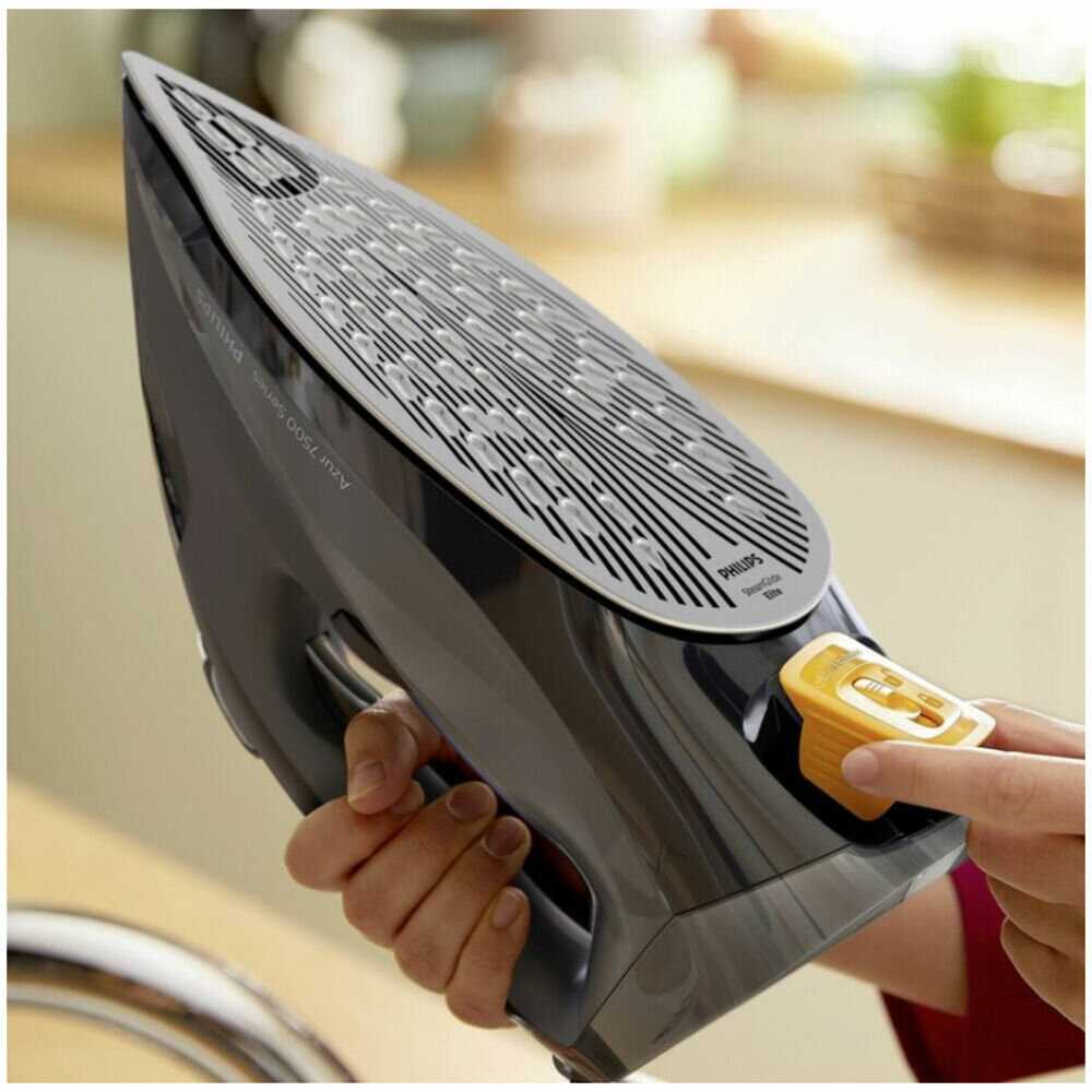 Основной минус — вес утюга (около 1,8 кг), который одни считают преимуществом для проглаживания плотных тканей, другие — утомительным при длительной глажке. Рукоятка широкая, с противоскользящим покрытием, но из-за массивности утюга запястье устает. Шнур длиной 2 метра критикуют за недостаточную свободу движений, особенно при сравнении с предыдущими моделями Philips. Автоматическое отключение через 8–10 минут вертикального положения работает корректно, однако пользователи жалуются на громкий звук помпы при подаче пара («тыр-тыр-тыр»). Заливное отверстие для воды узкое, а темный корпус затрудняет контроль уровня жидкости.