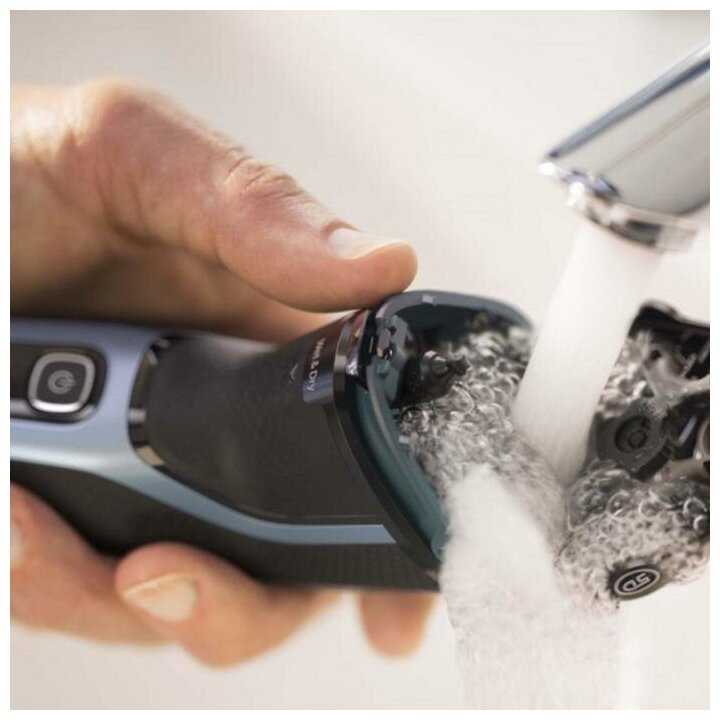 Быстрый заряд батареи, самозатачивающиеся лезвия, тример, очистка под струей воды.