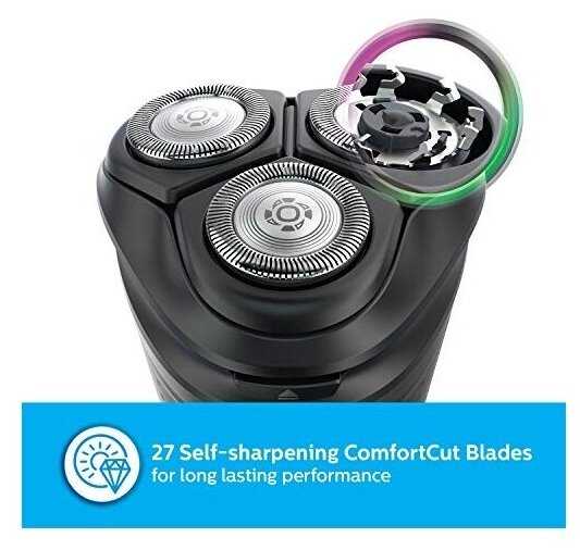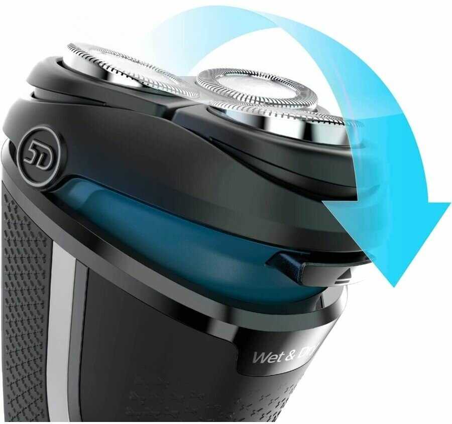 Плавающая головка имеет свободный ход по краю головки несколько миллиметров, что при бритье не играет особой роли (должна повторять контуры лица). Ножи в лезвиях одинарные (отличие от 5000 серии) но при желании можно заменить, хотя, пока бритва новая, на качестве бритья не сказывается. Удобная очистка под струей воды, намного быстрее, чем выскребать волоски кисточкой. Удобный, трехуровневый индикатор заряда батареи позволяет оценить хватит ли зарядки на еще раз побриться или нужно бритву ставить на зарядку. Полная зарядка занимает около часа, но, в отличии от предыдущей модели, во время зарядки не позволяет пользоваться, что указано на наклейке и в инструкции (вероятно защита от возможного поражения электрическим током при бритье). Размер стандартный, в руке лежит удобно, вес не большой, что приятно сказывается на процессе бритья. В комплекте есть чехол для переноски.