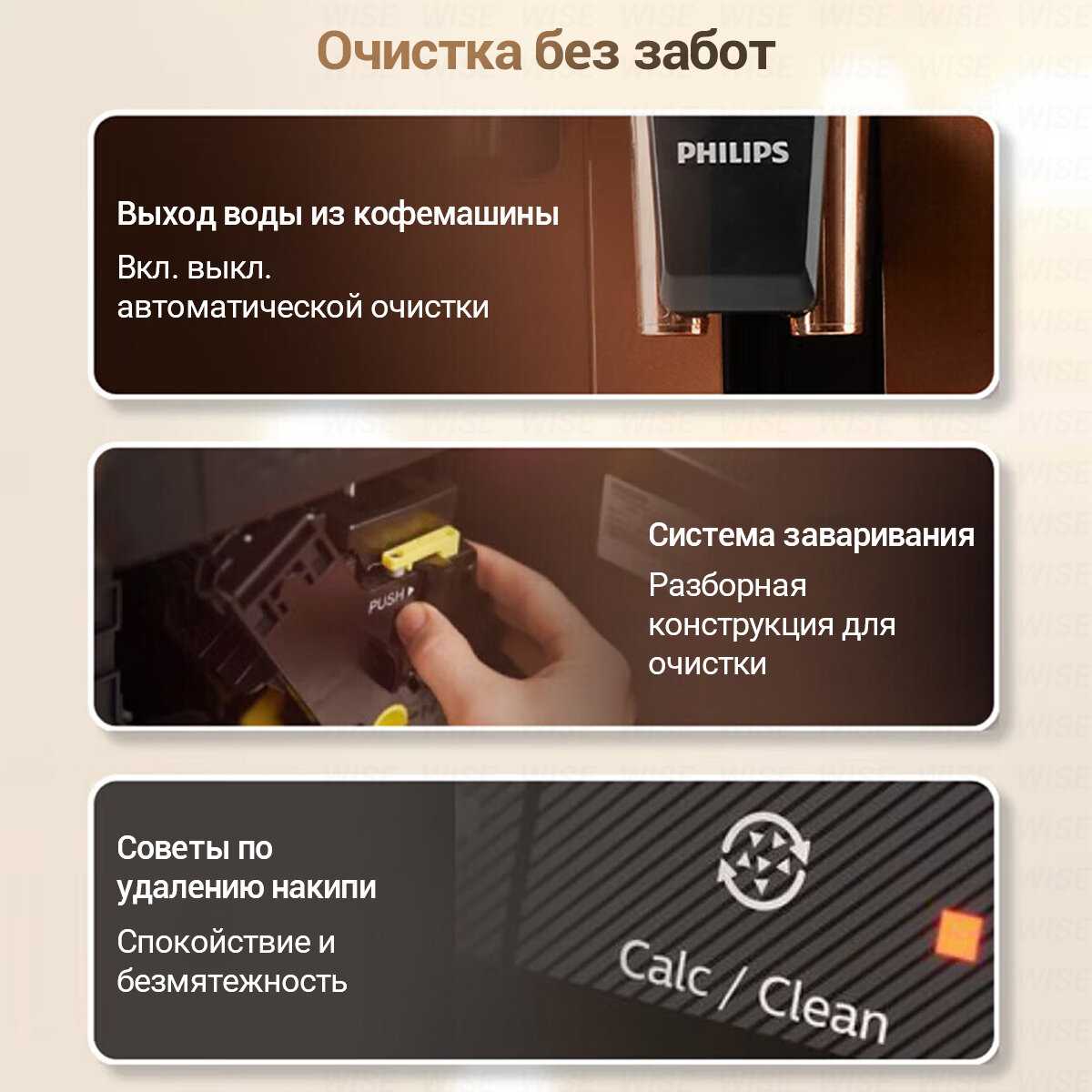 Конструкция предусматривает разборную систему для очистки, которую можно промывать и собирать обратно без специальных инструментов. Регулярное обслуживание включает промывку внутренних компонентов дважды в месяц и декальцинацию каждые 2-3 месяца. Капучинатор требует периодической прочистки от остатков молока для поддержания производительности. -