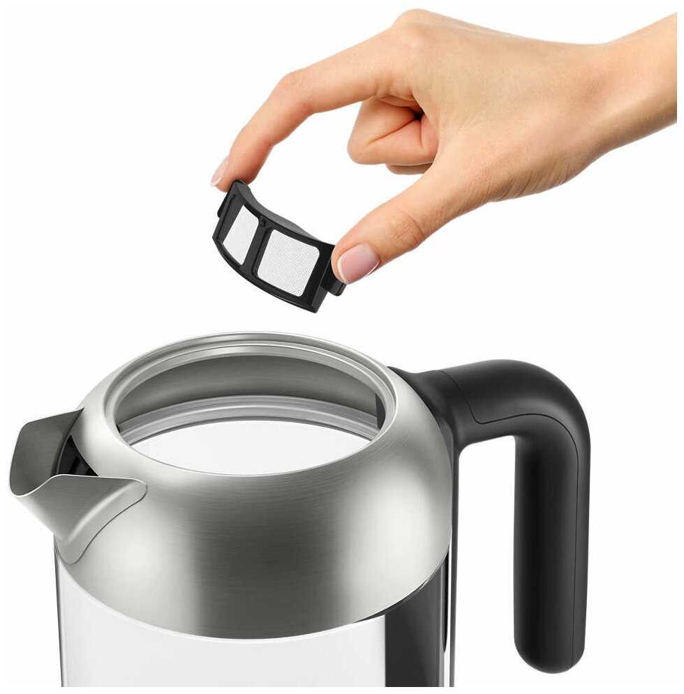 - + Стеклянная колба, съемная крышка и сеточка, удобная ручка, подсветка, красивый дизайн