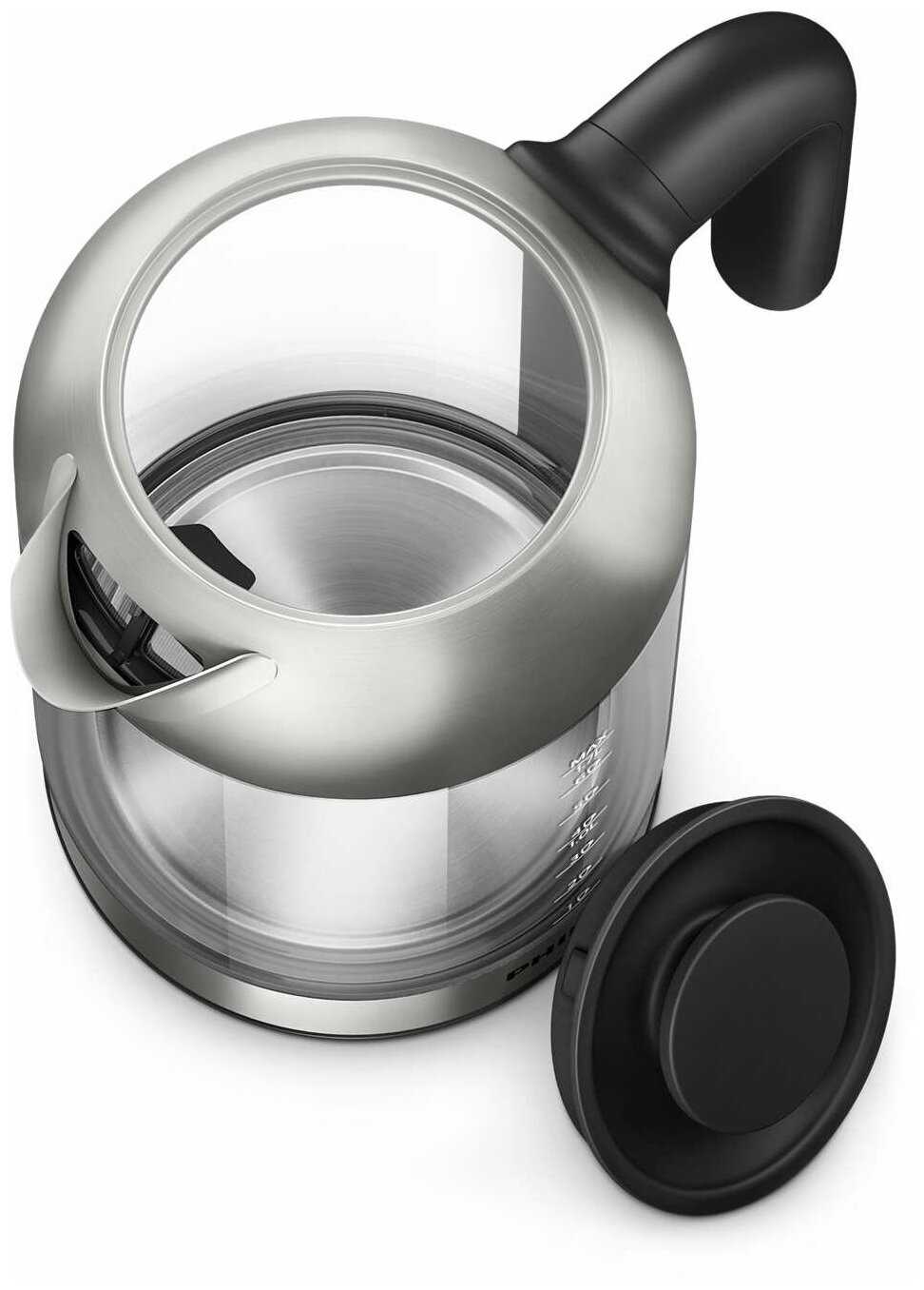 - Стеклянная колба с отметками по чашкам и литрам упрощает дозировку, виден процесс кипения.