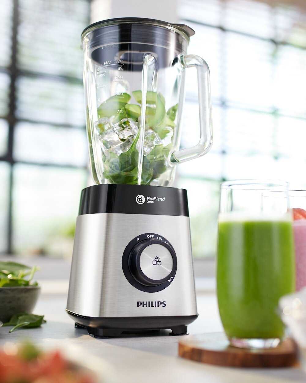 - + Блендер мощный, но при этом тихий. Быстро размолачивает сырые овощи в пюре. С фруктами справляется еще быстрее. Стоял выбор межлу Filips или Kitfort, т.к Kitfort использую уже два года. Выбрала Filips, чтр лучше смотрелся рядом с кофемашмной Filips и ещё у него больше стакан. Очень довольна покупкой.