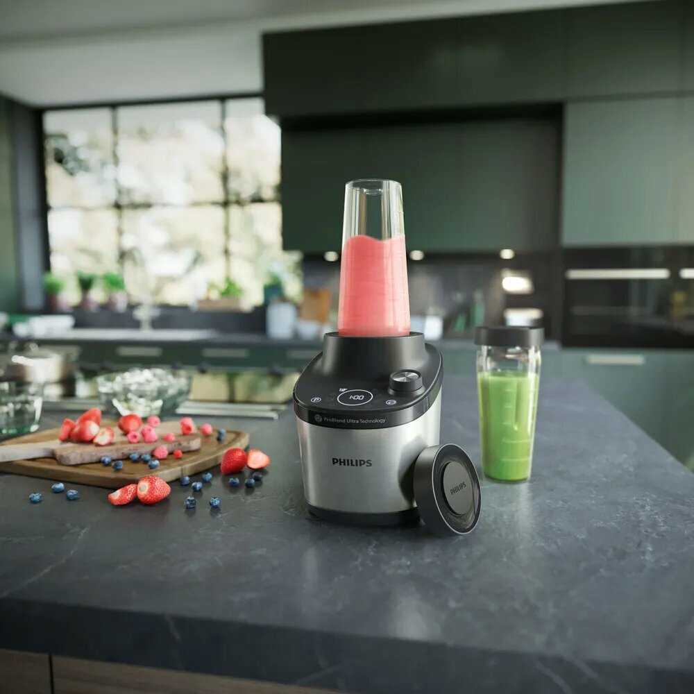 В комплекте есть два пластиковых дорожных стакана с крышками для порционных коктейлей и мерный колпачок на 50 мл. Пользователи активно используют стаканы для смузи "на вынос", а мерник — для точного дозирования протеина или мелких ингредиентов. Это избавляет от необходимости мыть основной кувшин при приготовлении одной порции. -