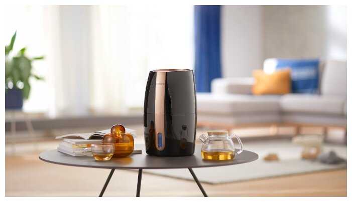 - Внешний вид современный, вписывается в любой интерьер (черный, белый или золотистый цвета), не выглядит как типичный увлажнитель; компактный, занимает мало места.