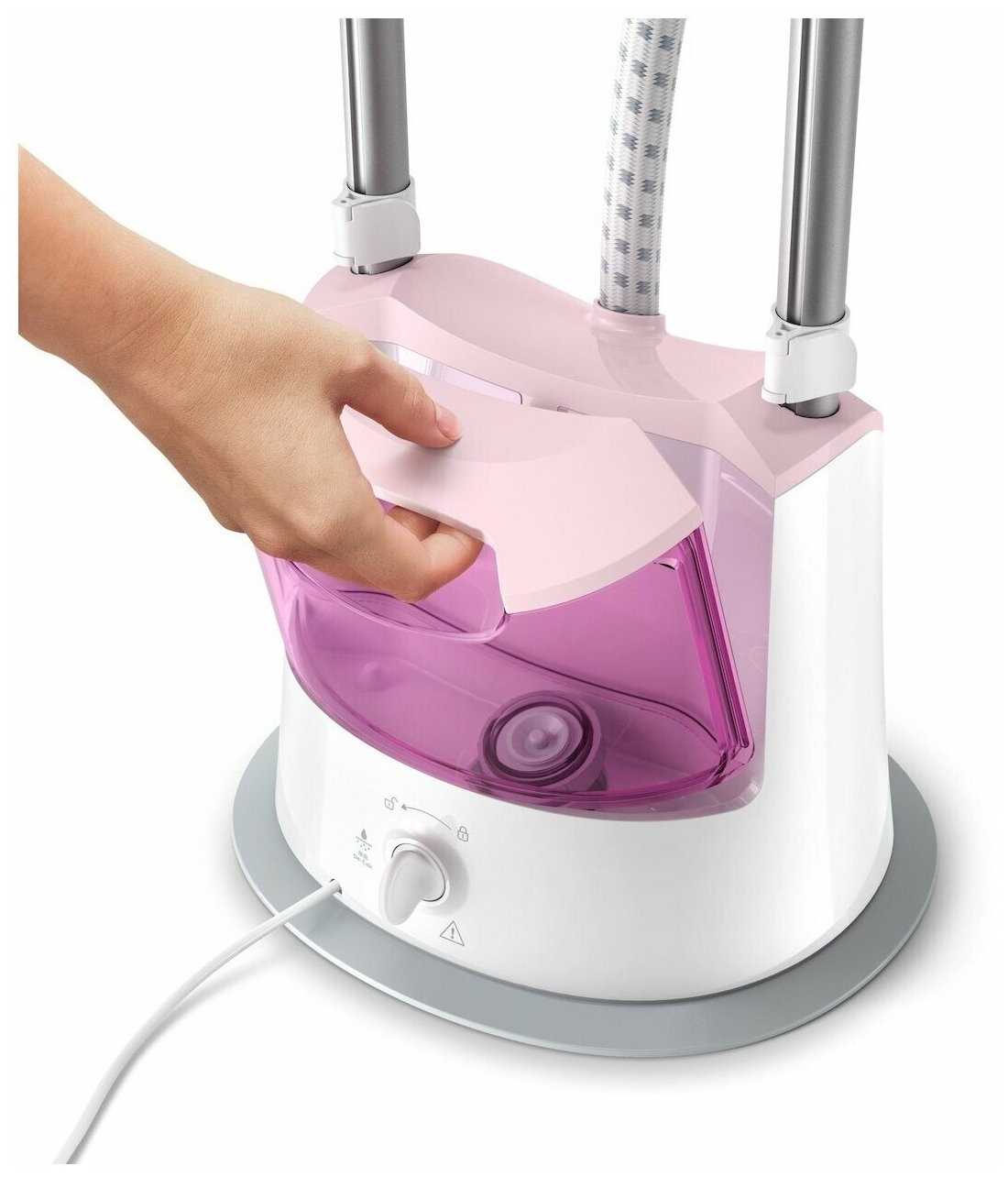 Конструкция и удобство использования: Телескопическая стойка регулируется по высоте, но её максимальной длины недостаточно для обработки низа длинных платьев или мужских рубашек — шланг перегибается, блокируя подачу пара. Крепление насадки к подставке ненадёжное: при случайном движении она падает, рискуя повредить пол или обжечь пользователя. Жёсткий шланг усложняет маневрирование — чтобы отпарить одежду с изнанки, приходится снимать её с вешалки и перевешивать. Резервуар для воды объёмом 1,6 л съёмный, но при наклоне или переноске протекает, оставляя лужи. Процесс долива воды неудобен: необходимо полностью снимать бак, откручивать крышку и аккуратно устанавливать его обратно, чтобы избежать проливания. Дополнительные аксессуары, такие как термоварежка и спинка для рубашек, полезны, но держатель для брюк отсутствует — пользователи используют обычные вешалки с прищепками.