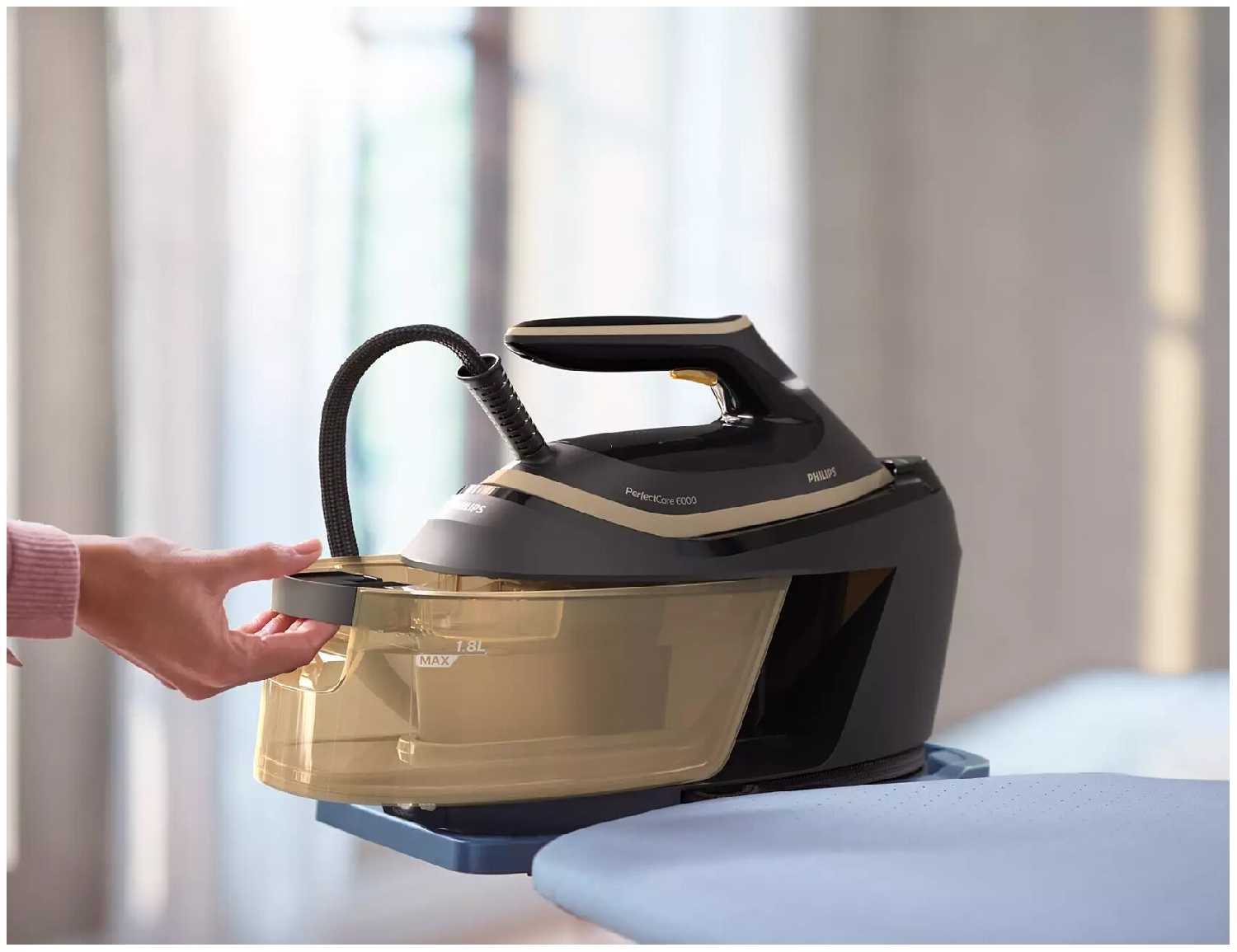 Лёгкий вес утюга — ключевое преимущество, многократно упомянутое в отзывах: пользователи подчёркивают, что рука не устаёт даже при длительной работе. Открытая прямая форма ручки, вызывавшая сомнения, на практике оказалась комфортной. Однако горизонтальная платформа для установки утюга многим кажется менее удобной, чем наклонная (45°) у предыдущих поколений Philips — подъём требует усилий. Длина шланга позволяет комфортно гладить вертикально, но фиксация утюга на подставке реализована неидеально. Серьёзный минус — неотсоединяемый резервуар объёмом 2.5 литра, осложняющий наполнение и слив воды. Пользователи также отмечают трудности с полным удалением воды перед хранением.