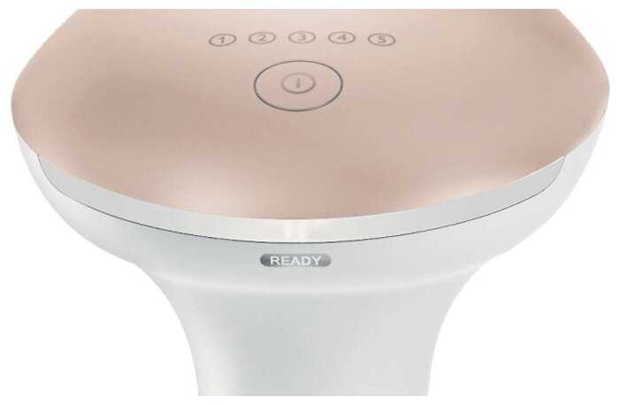 1. Кнопка включения устройства и управления режимами (5 настроек интенсивности светового импульса в зависимости от типа кожи/волос). Использовала фотоэпилятор пока всего один раз и выбрала 2 режим. Изначально довольна сложно по картинкам определить тип кожи и выбрать самой подходящий режим.