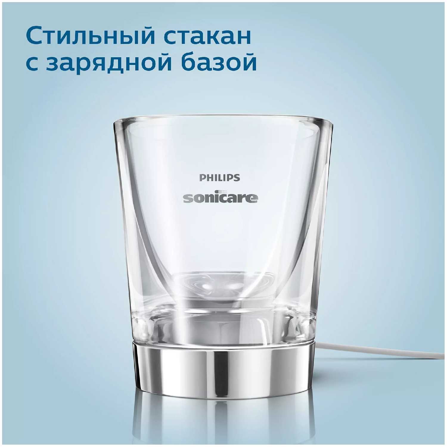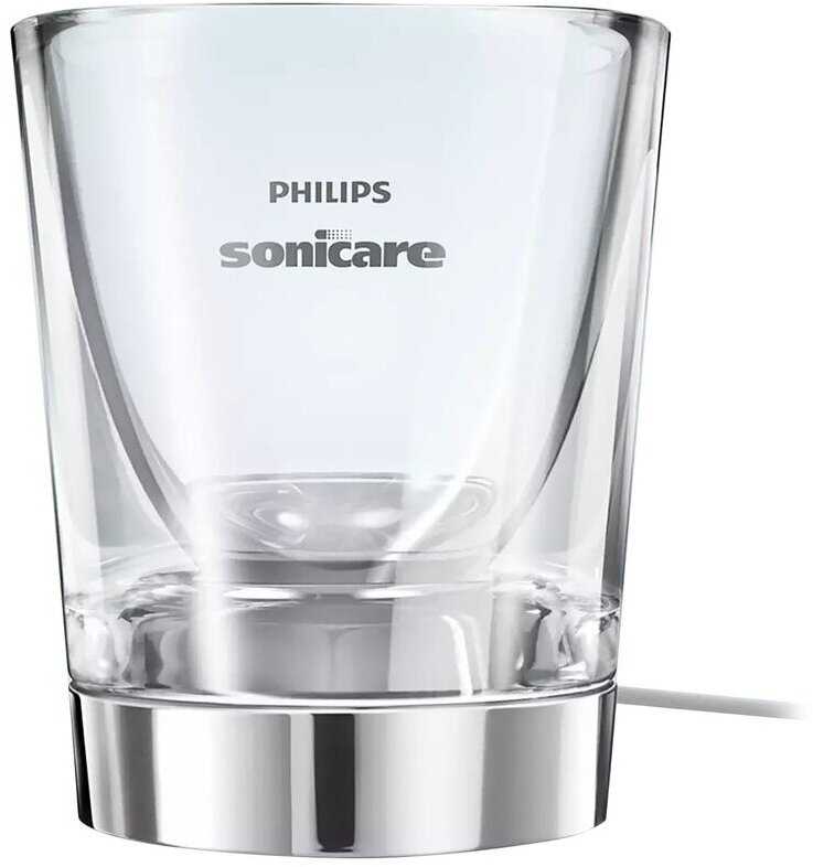 Стакан позволяет хранить щетку вертикально и заряжать ее без прямого подключения к розетке, что экономит место в ванной. Его стеклянная конструкция выглядит эстетично, а беспроводная технология упрощает использование. Однако зарядка возможна только с оригинальными аксессуарами Philips, что ограничивает применение в поездках без дорожного футляра. -