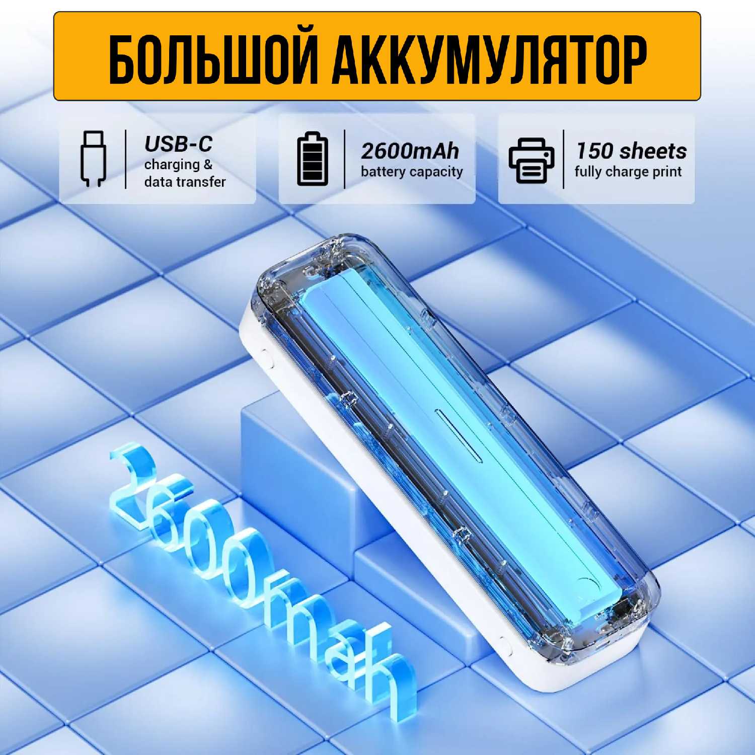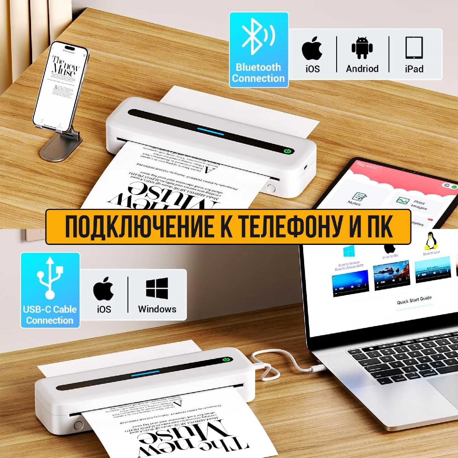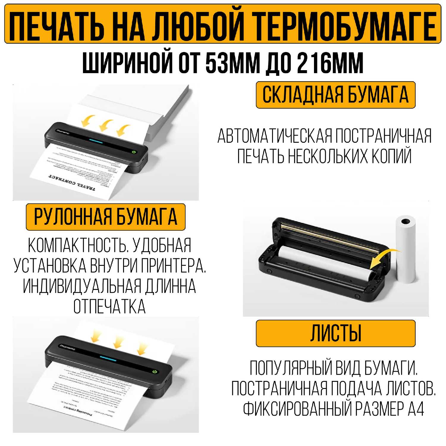 Комплектация : | Термопринтер 1шт., Рулон бумаги А4, Сумка для хранения, Переходник USB A - USB C, Провод для зарядки |