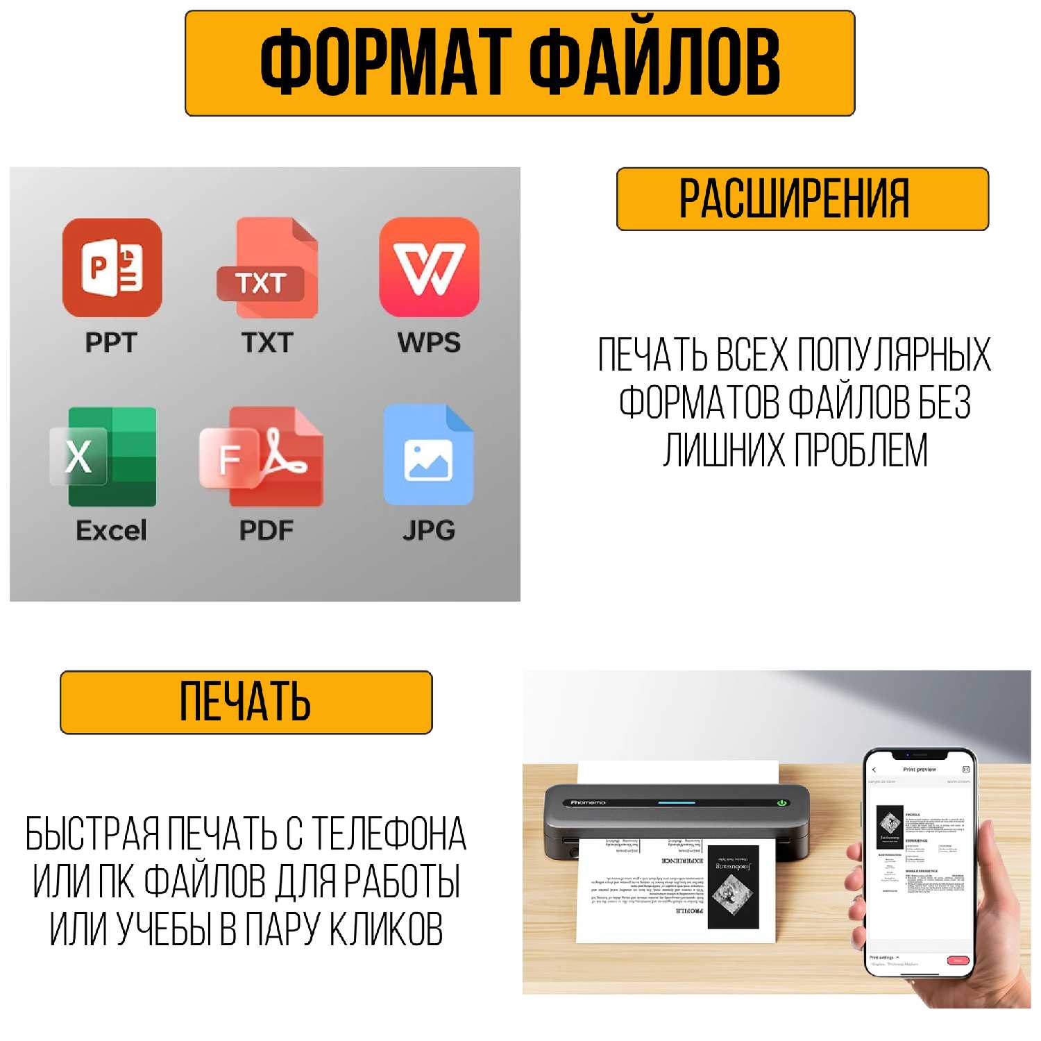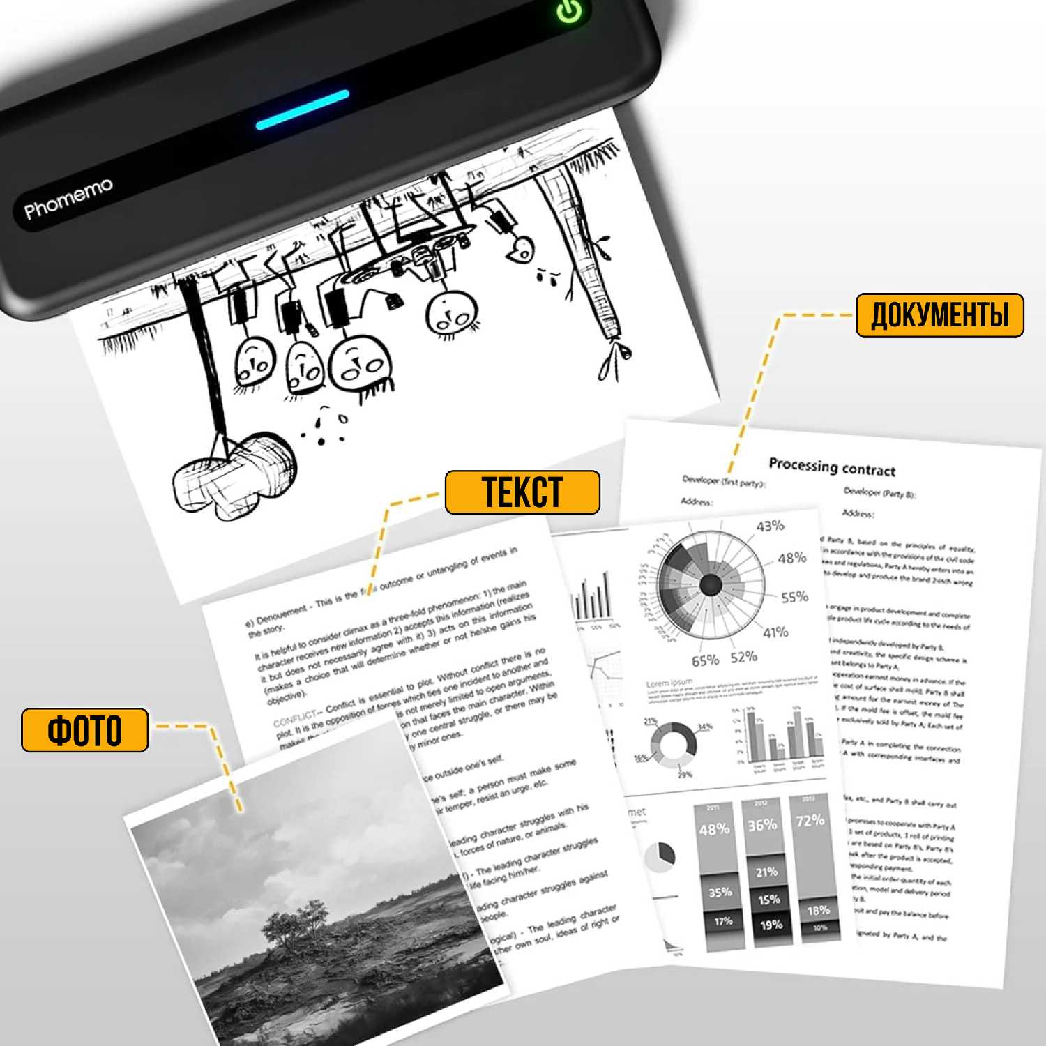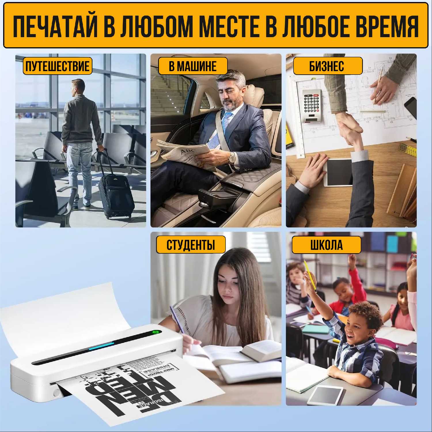 Комплектация : | Термопринтер 1шт., Рулон бумаги А4, Сумка для хранения, Переходник USB A - USB C, Провод для зарядки |