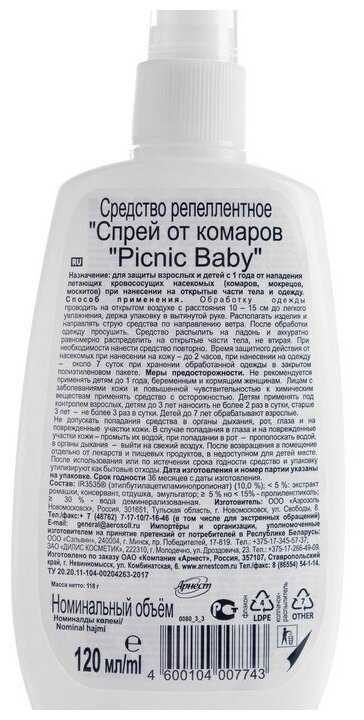Характеристи Picnic Спрей от комаров с экстрактом ромашки