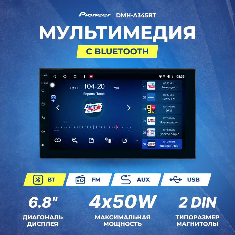 "DMH-A345BT - это USB-ресивер формата 2DIN (короткое шасси) с 6,8-дюймовым емкостным экраном и с особым акцентом на использование смартфона в автомобиле." с сайта Пионер.