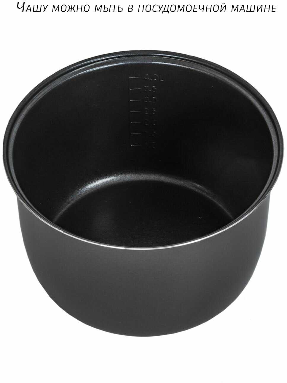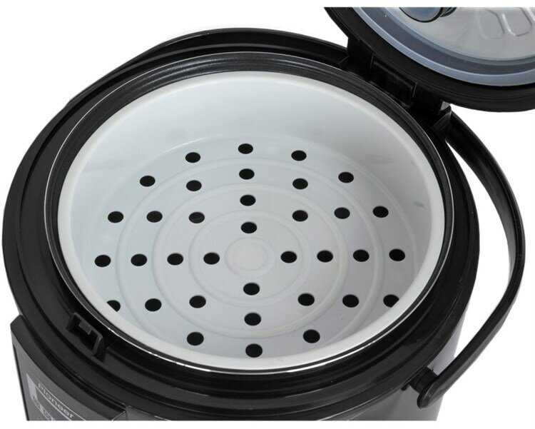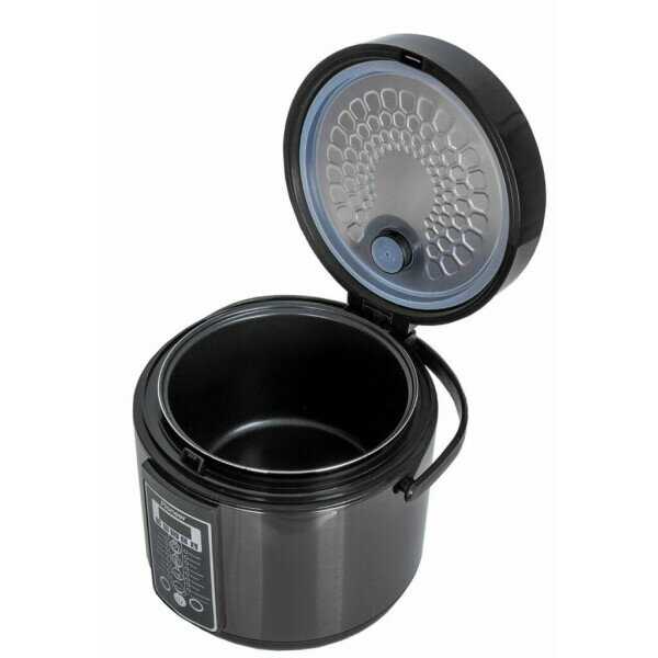 - + Большой объем, 5 литров, но реально лучше использовать 4 литра, чтобы не до краев наливать.