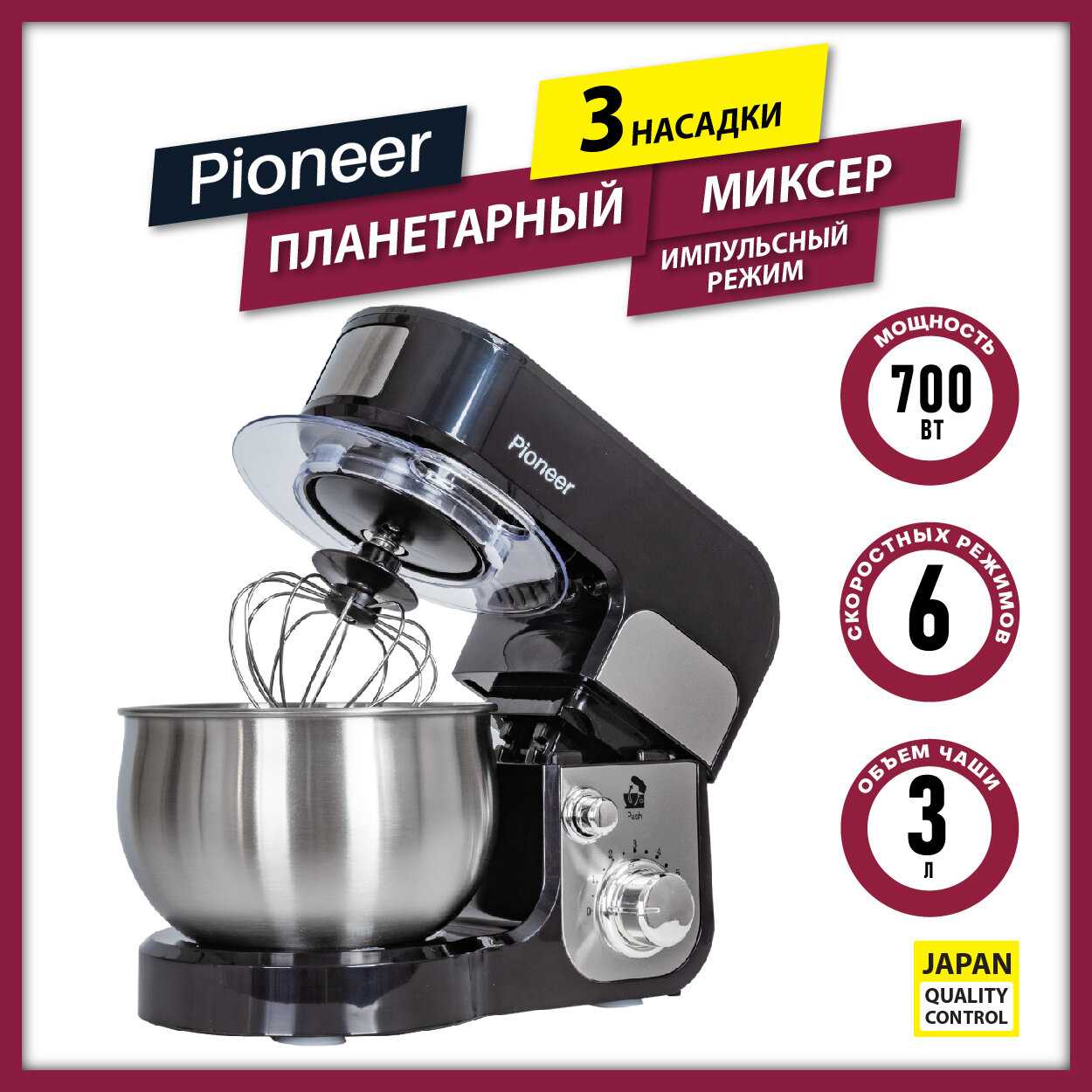 Отзывы о Миксер планетарный Pioneer с чашей из нержавеющей стали 3 л, 6 скоростей, 3 насадки, защита двигателя от перегрева, 700 Вт