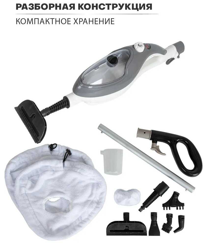 - Регулируемая мощность пара позволяет адаптировать интенсивность очистки под разные поверхности (линолеум, ламинат, стекло).