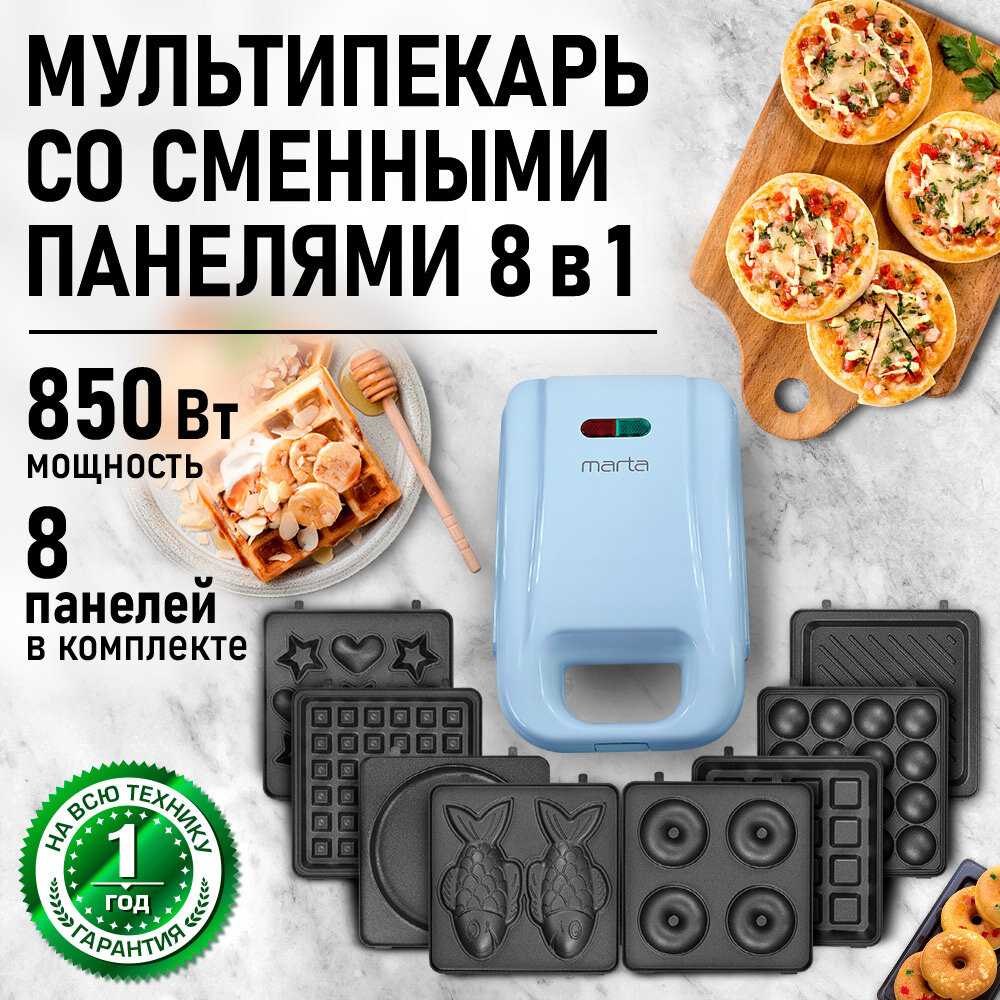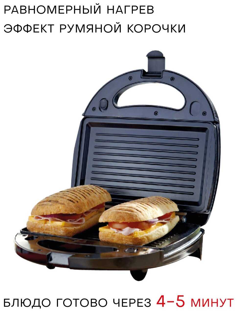 В комплекте идут три сменные панели: пара панелей для приготовления на гриле мяса или овощей, пара панелей для приготовления различных сэндвичей, пара панелей для выпечки венских вафель с различными начинками. Прибор оснащен термостатом, мощность 850 Вт.