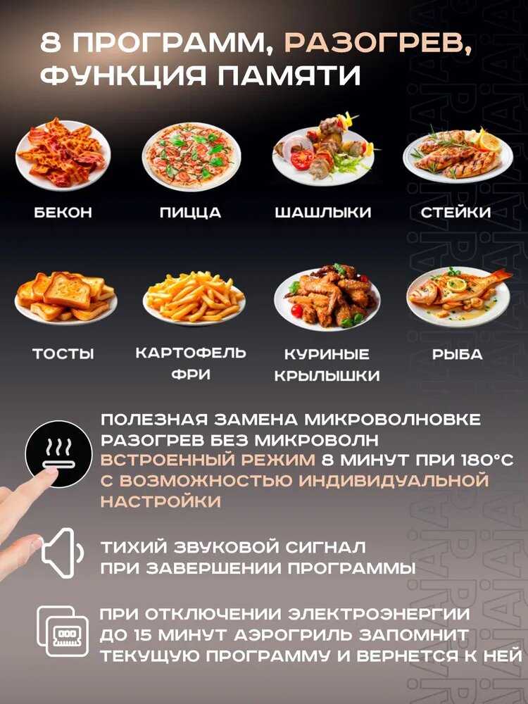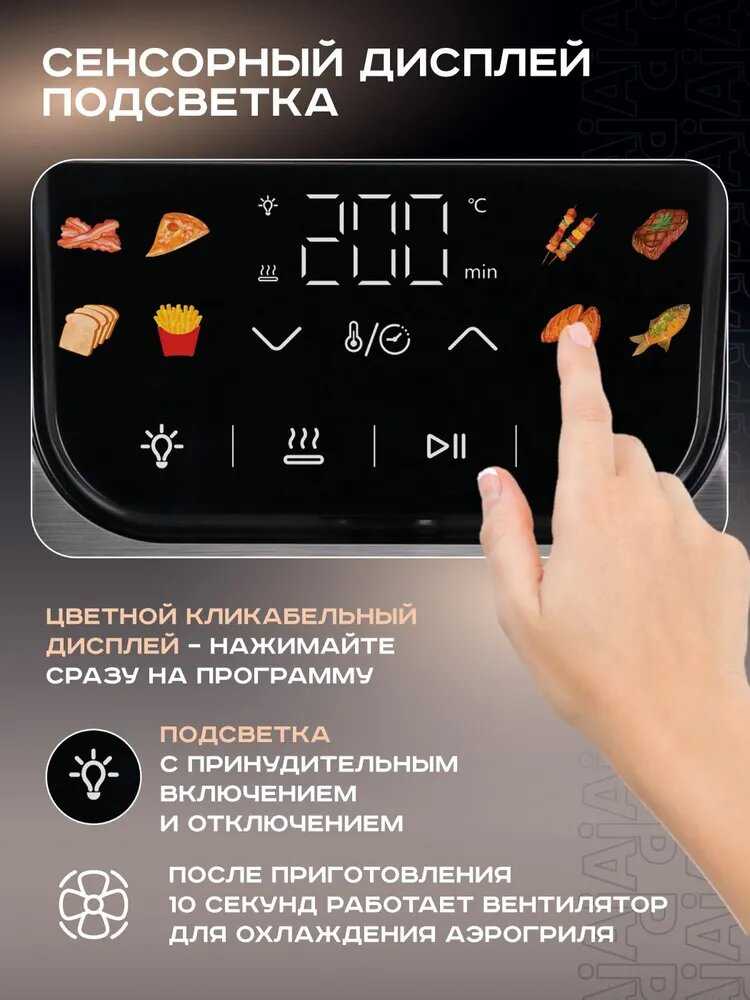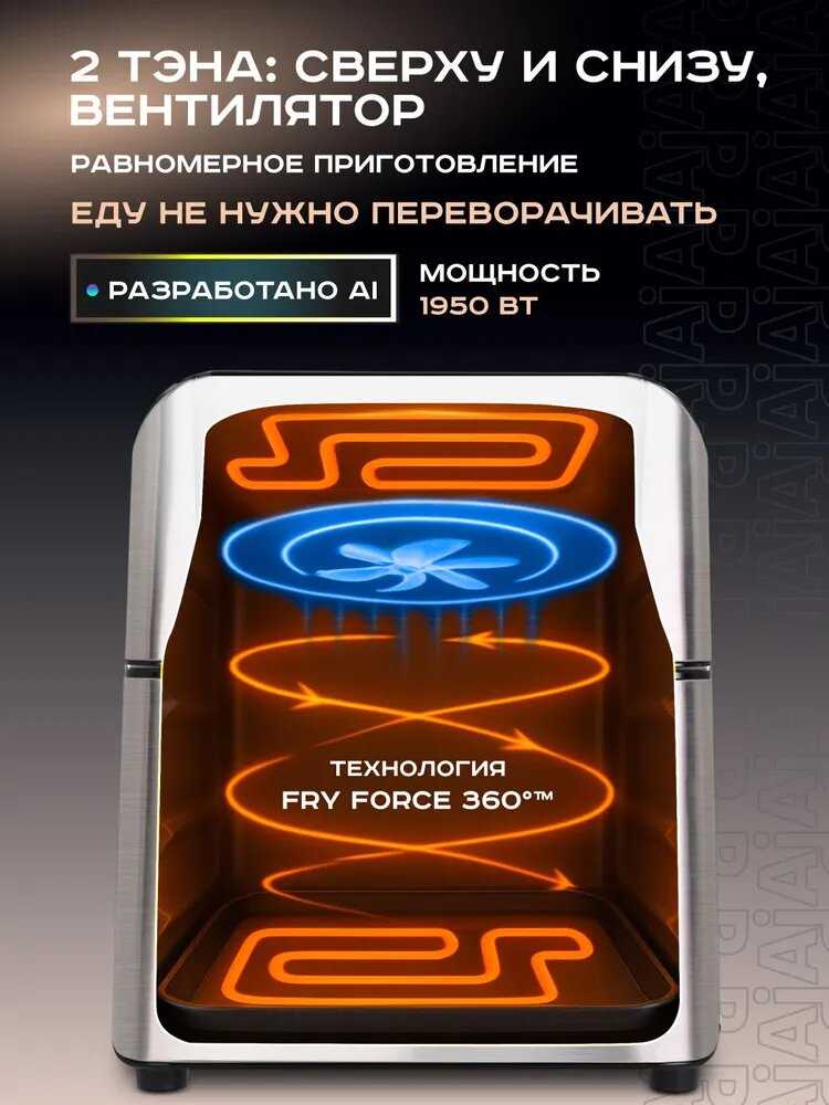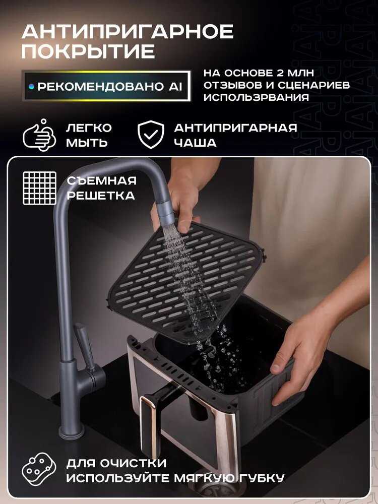 - + Внешне выглядит круто и современно, прям как гаджет из фантастики. Корпус сделан из металла, а не из пластика, как у некоторых других моделей, что сразу добавляет надежности. Объем чаши в 6,5 литра идеально подходит для двоих, не больше и не меньше. Управление через электронный дисплей простое до безобразия, даже пожилые родственники быстро разберутся без проблем. В работе устройство выдает отличный результат: мясо и овощи покрываются аппетитной хрустящей корочкой снаружи, а внутри остаются сочными и вкусными. Картошка фри получается такой же вкусной, как в фастфуде, но гораздо полезнее, без лишнего жира. Плюс равномерное пропекание всего, что кладешь, без масла совсем, и в целом пользоваться удобно, функционал на высоте.