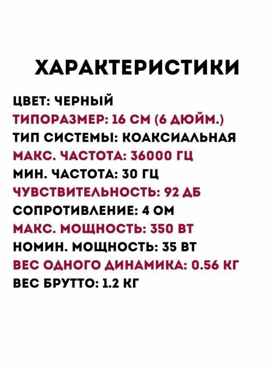 Комплектация : | · Динамики 2 шт. · Защитные сетки 2 шт. · Провода для подключения · Крепления для саморезов 8 шт · Саморезы для акустики 8 шт. |