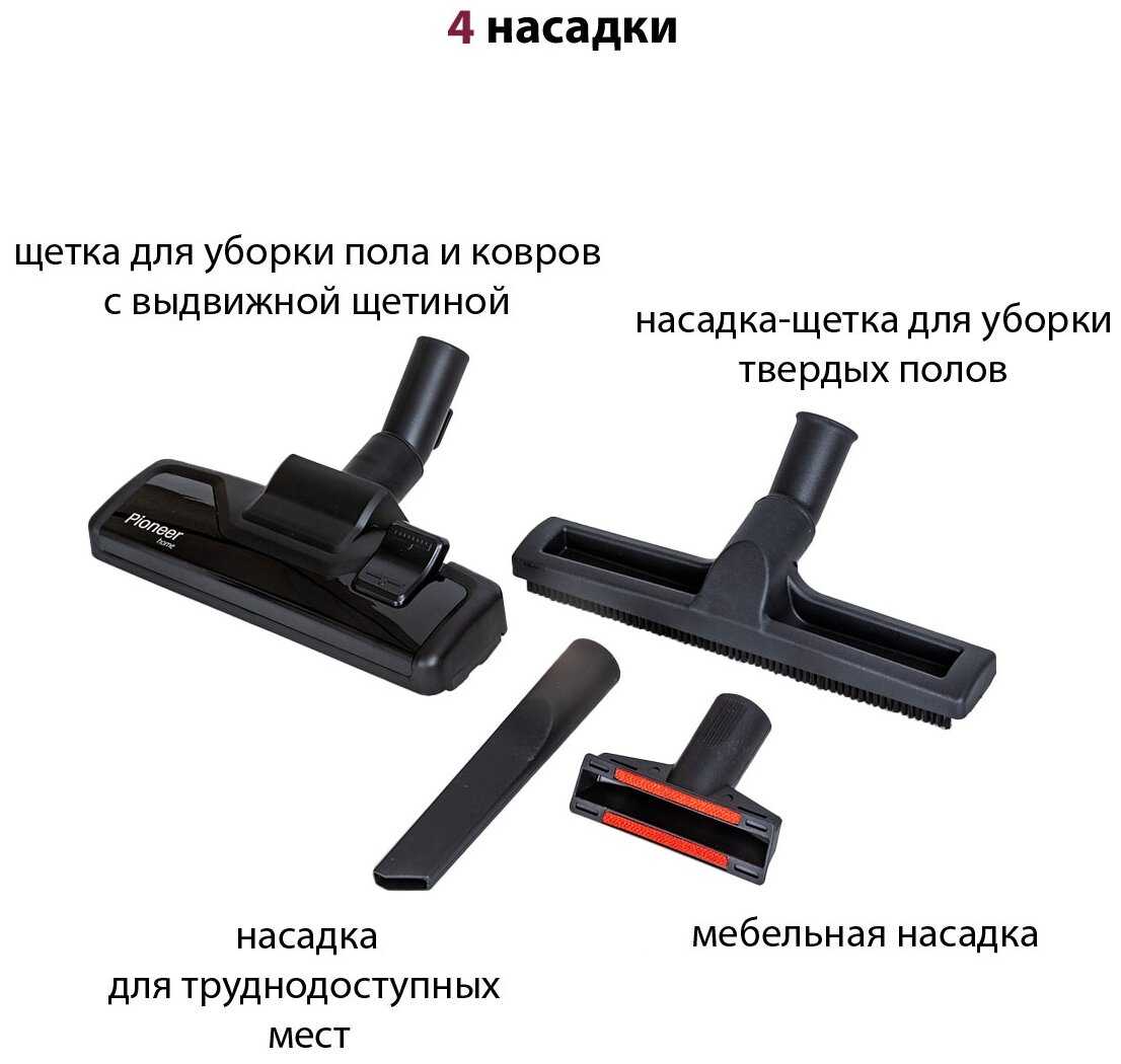 - Отсек для насадок на корпусе позволяет быстро переключаться между уборкой пола, мебели и труднодоступных углов.