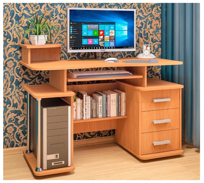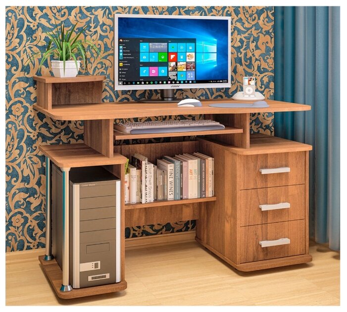 Сам стол хороший. На нем удобно все разместить. Есть ящики под документы, полки.