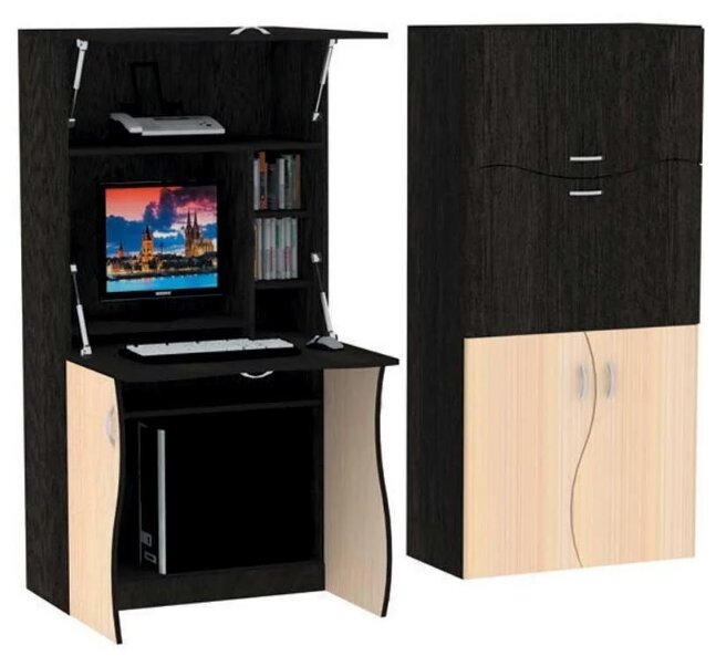 - Трансформерная конструкция позволяет быстро превращать шкаф в рабочий стол и обратно, что удобно для нечастого использования.