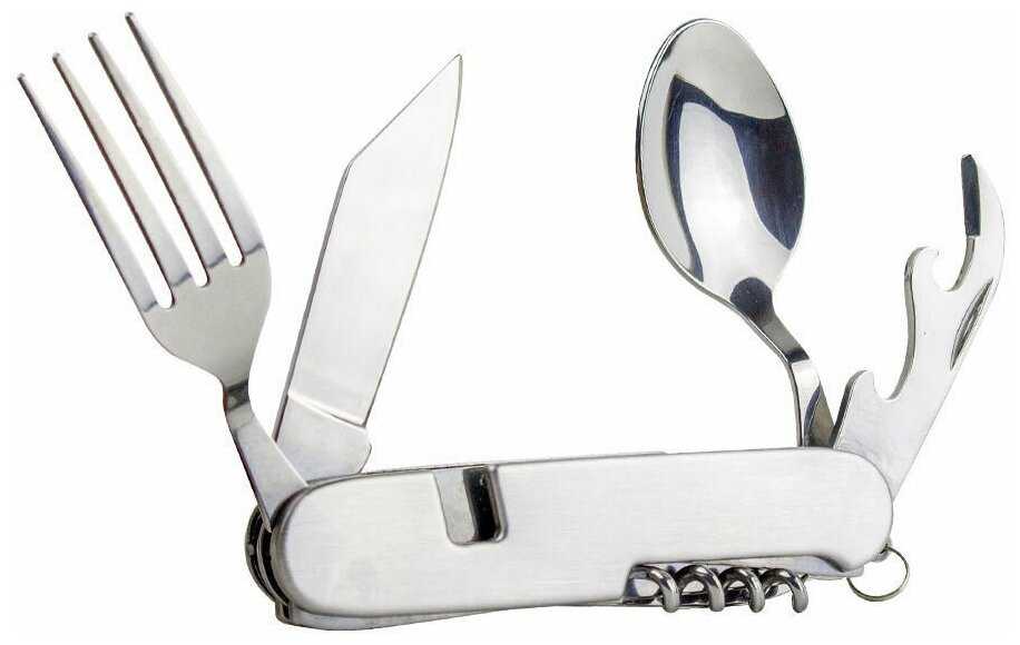 - + отличная штука. Ложка - реально большая, вилка норм, нож, открывалка, шило, штопор и ещё малюсенькая ложечка - то ли для посолить, то ли в носу поковыряться. Собирается в единый девайс легко.