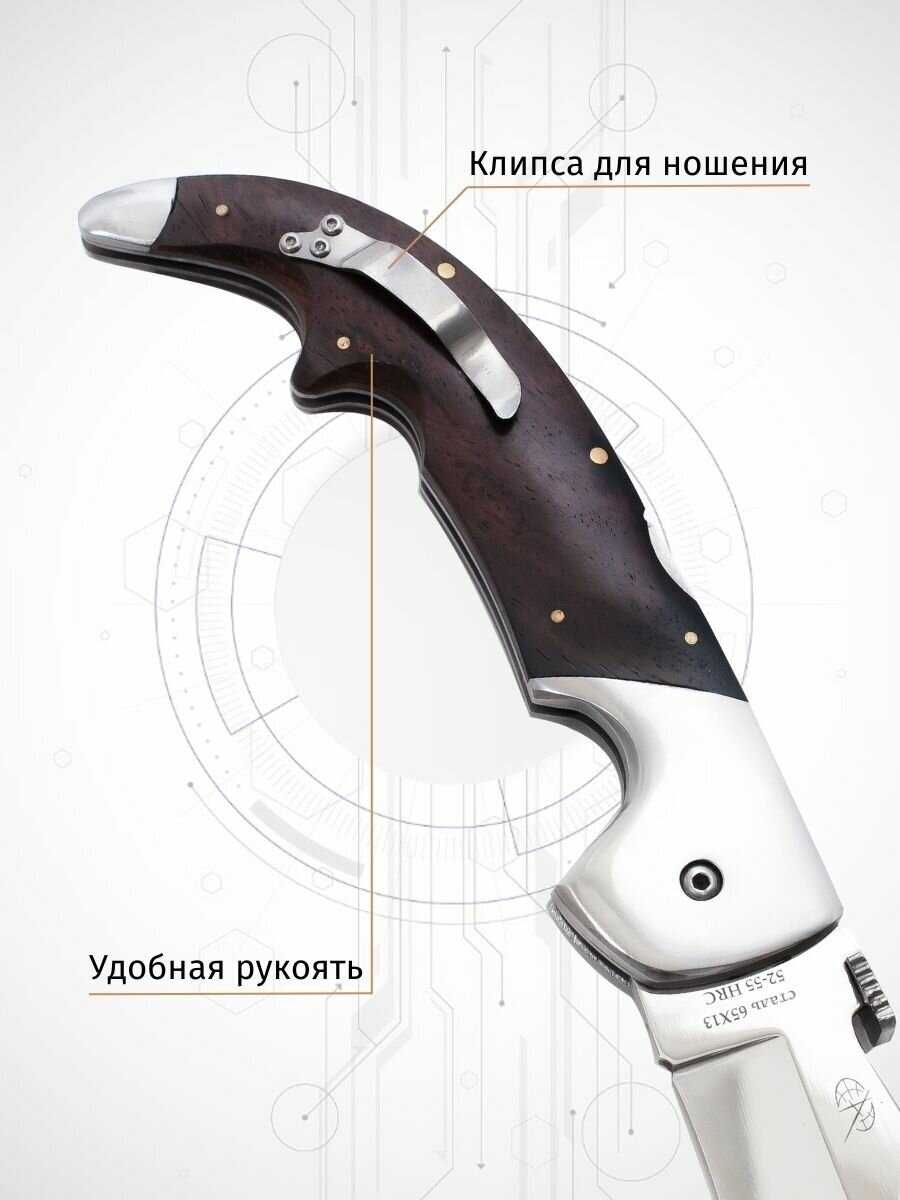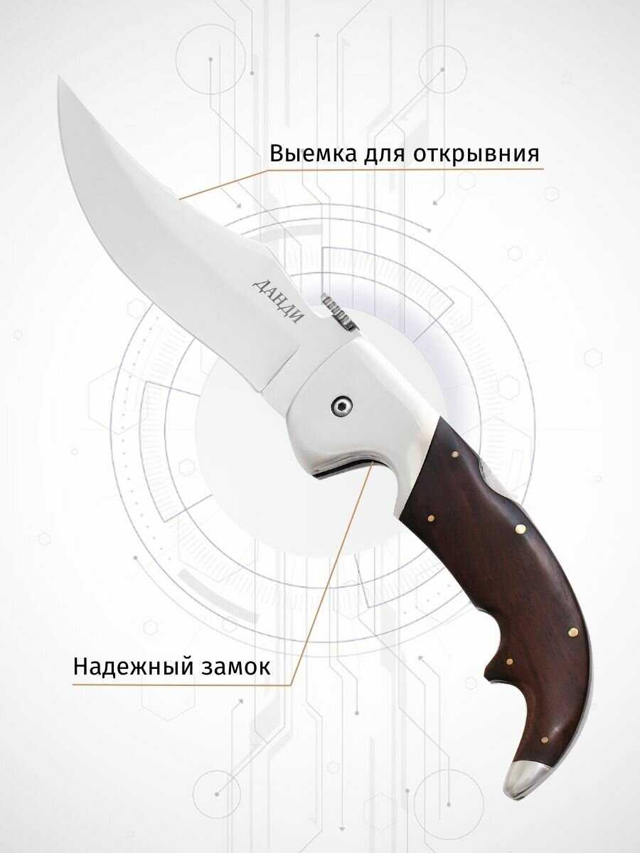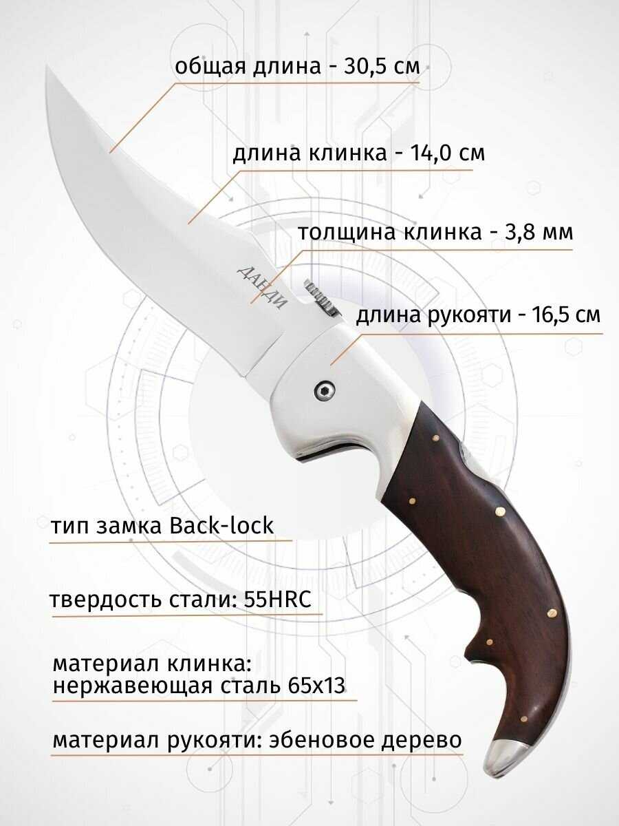 - + Хорошая фиксация клинка складного туристического ножа " Данди". Толщина обуха соответствует для применения в лесных походах и охоте за дичью, грибами.
