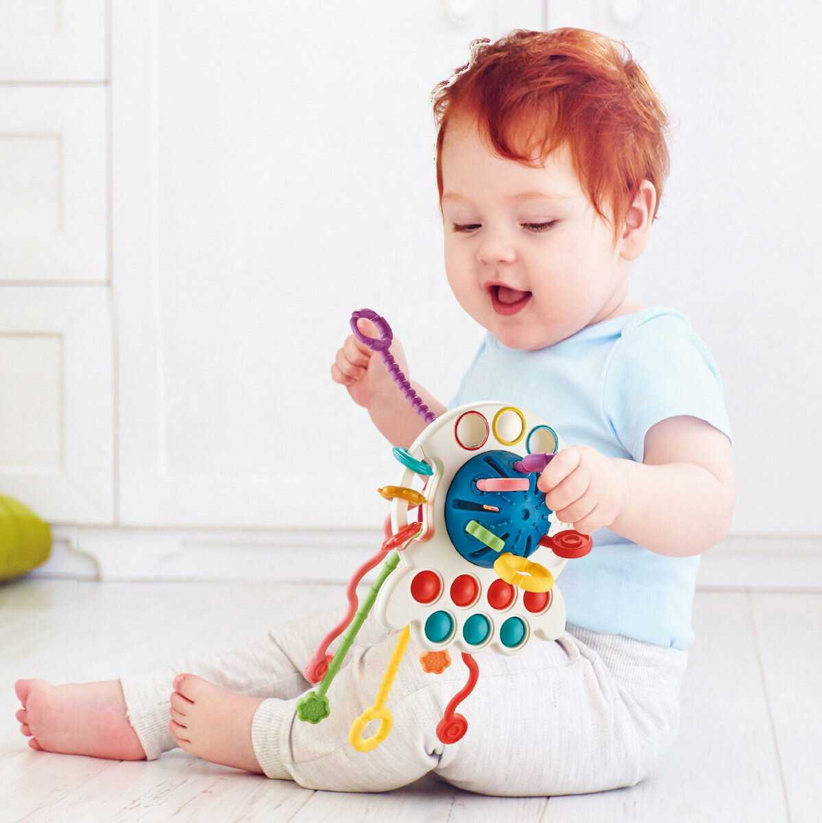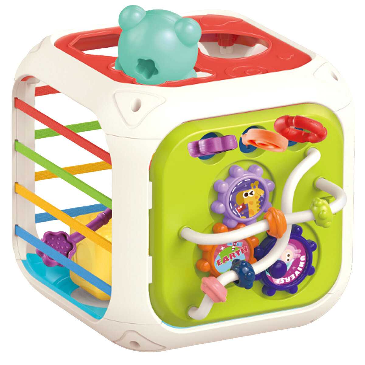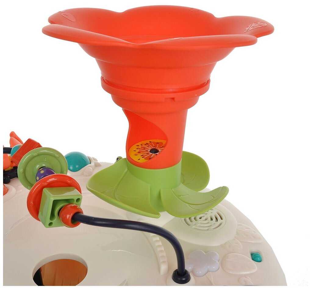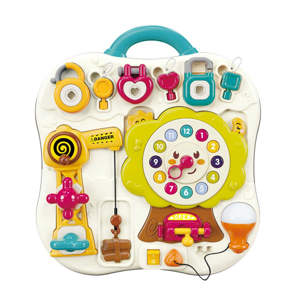 Столик двусторонний, с одной стороны бизиборд: шестеренки, руль с пищалкой, конструктор, различные рычаги, за которые ребенку интересно хвататься