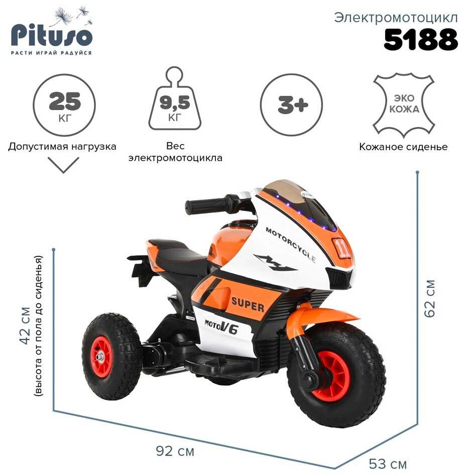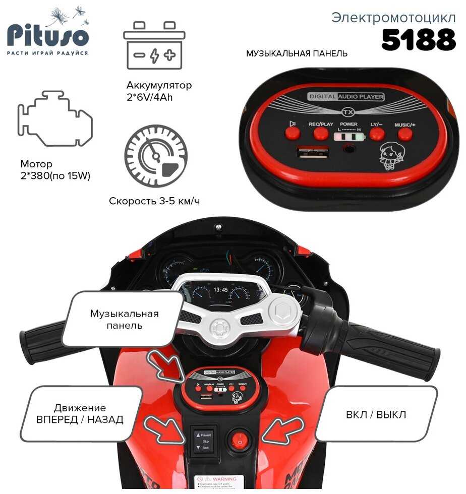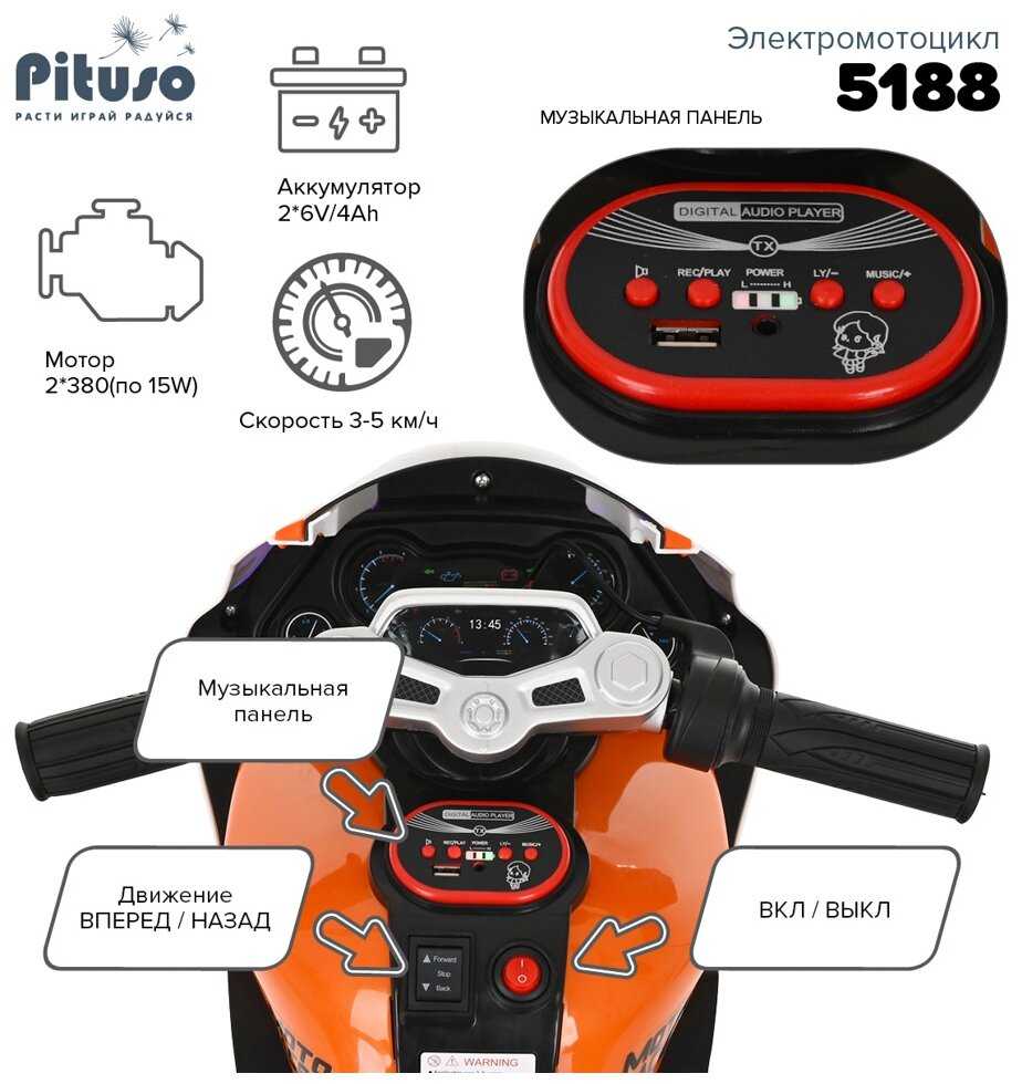 Дополнительная информация : | высота от пола до сиденья: 42 см, ручка "газа" на руле, музыкальная панель 4 музыкальных мелодий AUX, надувные колеса, сиденье экокожа, скорость 3-5 км/ч, размеры упаковки: 85х37х43 см, вес в упаковке: 10.5 кг |