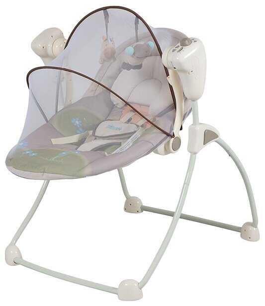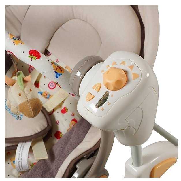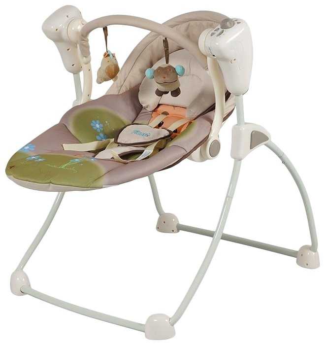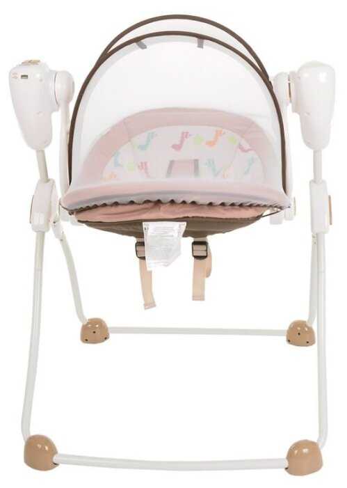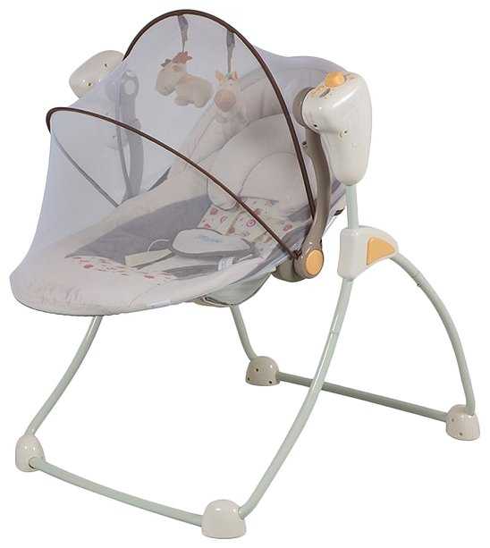 - + Отличная штука. Сиденье регулируется- есть лежачее положение, полусидя и сидя. Встроенная музыка приятная, кроме того есть usb вход для mp3 плеера или флешки! Проверила, все прекрасно играет. В комплекте москитная сетка на дугах, что немаловажно для наступающего лета. Качели работают от 4 батареек АА, либо подключаются к розетке через прилагаемый адаптер. Да, еще есть пульт.
