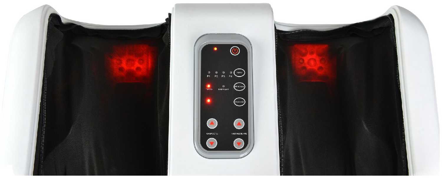 Инфракрасный прогрев включается отдельно или в комбинации с любым режимом, но его интенсивность субъективна: владельцы с размером ноги 36-37 отмечают слабое тепло (из-за расстояния до зоны нагрева), тогда как пользователи с размером 42+ чувствуют его явнее. Максимальный эффект проявляется к 10-й минуте сеанса. Зимой функция особенно ценится за быстрое согревание стоп. -