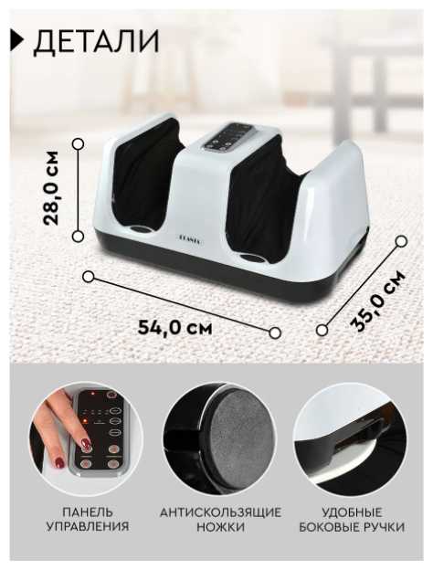 Прибор комфортно вмещает стопы от 29 детского до 45 мужского размера. Для 43-45 размера важно корректно позиционировать ногу: при глубоком погружении боковые подушки могут давить на верхнюю часть стопы. Решение — не опускать ногу до упора либо использовать ручной режим с уменьшением компрессии. -
